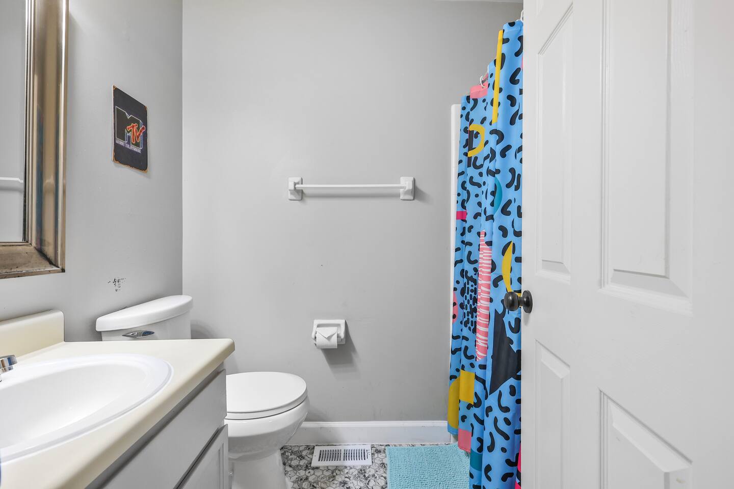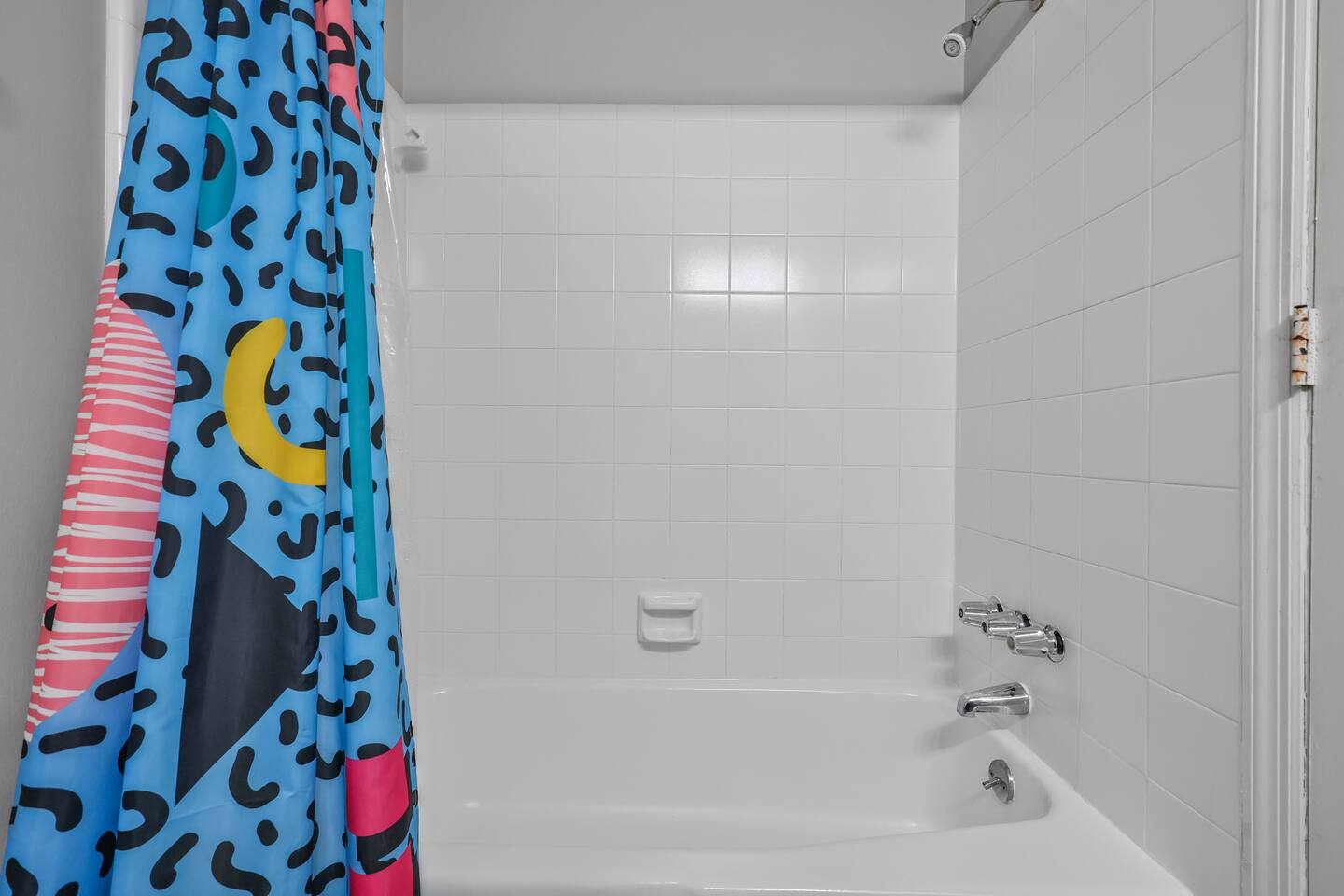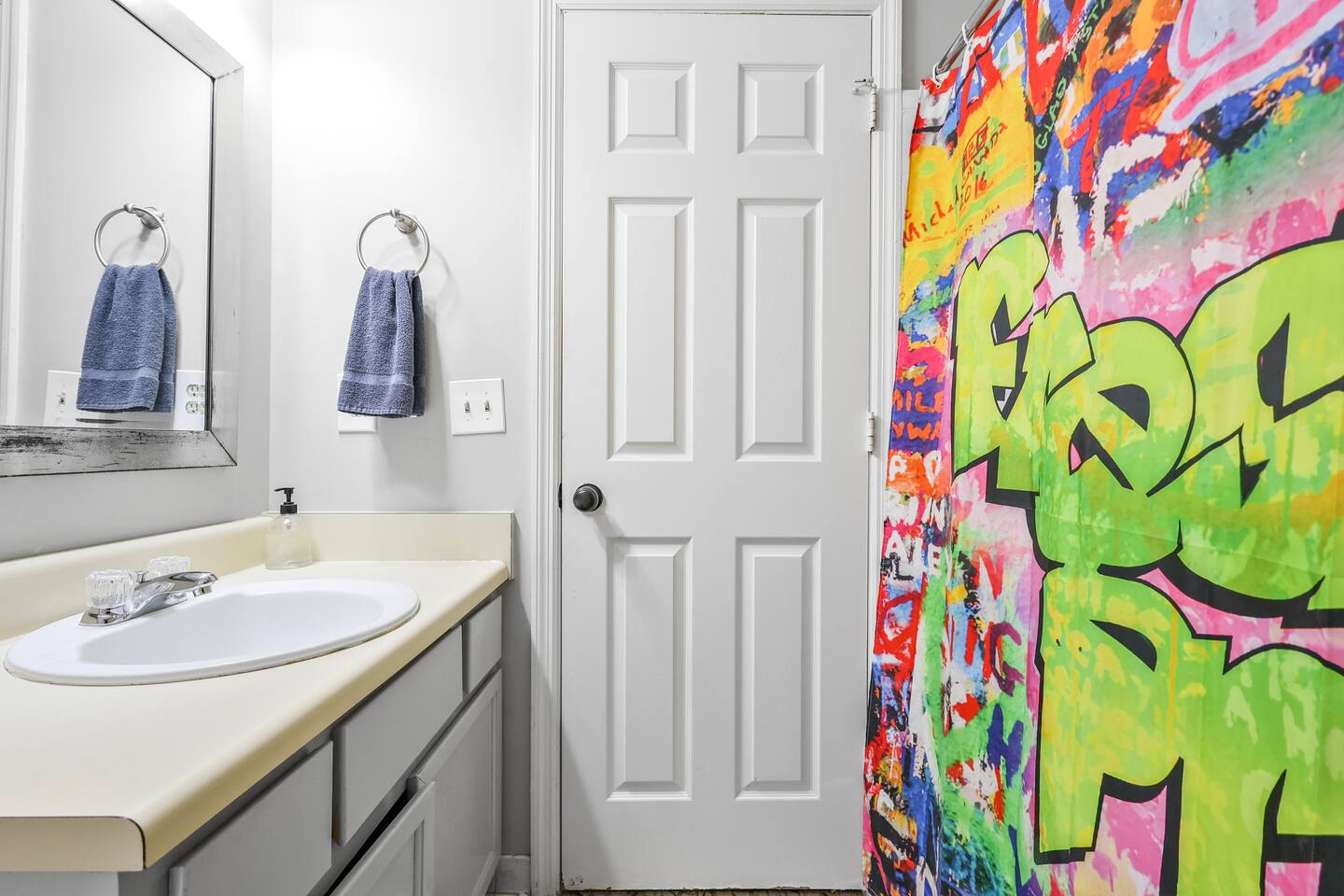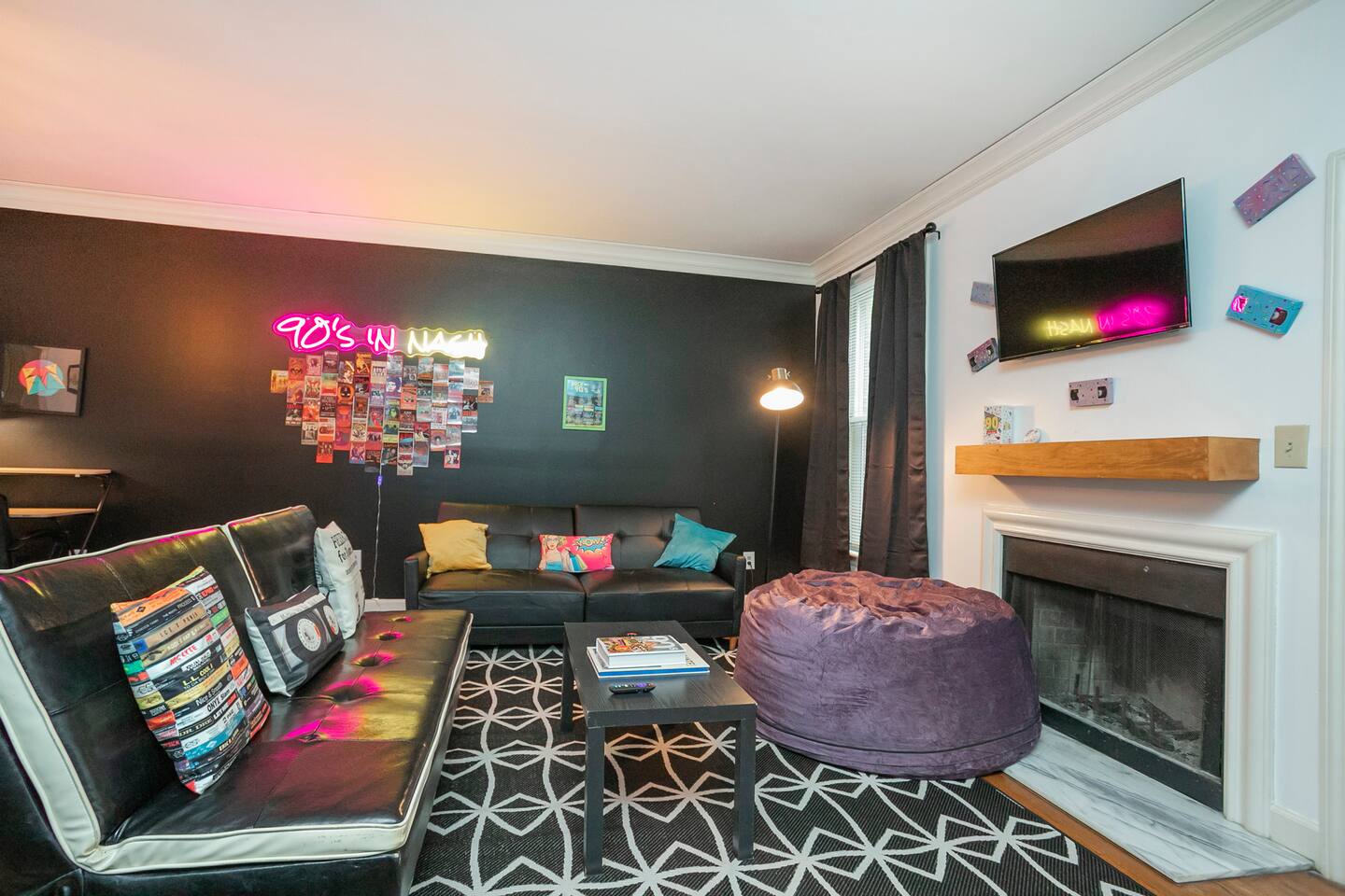 Our fav 90's nostaglia brought to life! Poster's hung up middle school style, bright colors, Saved by the Bell design mixed with a selfie wall throwing it back to large cell phones + Slater's Slating:) 1st floor: ->full kitchen ->living area with two futons and a twin bed ->4 seater dining ->1/2 bath ->outdoor patio 2nd floor: ->two queen bedrooms each with an ensuite RENOVATED bathroom!