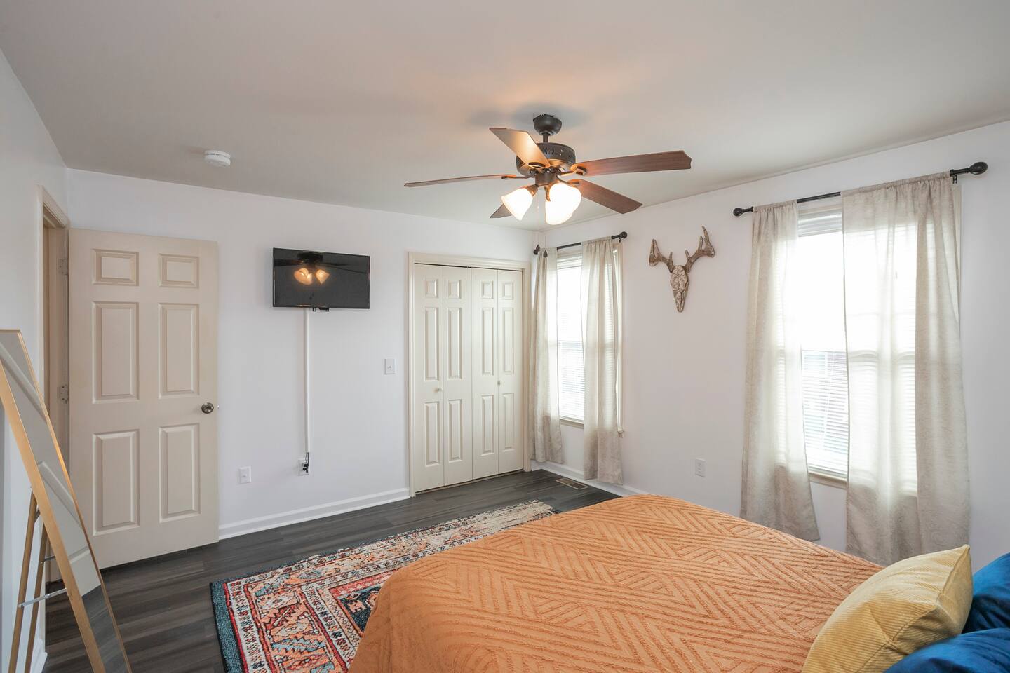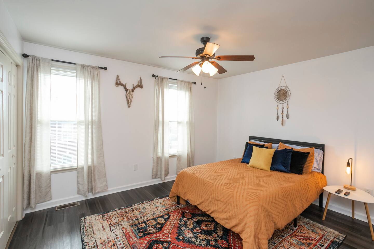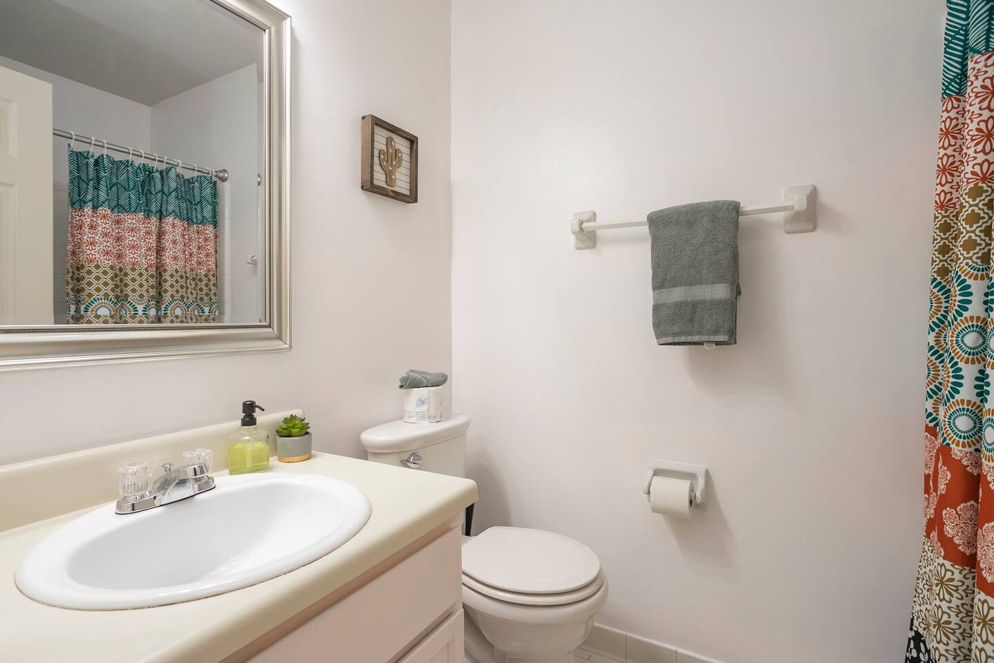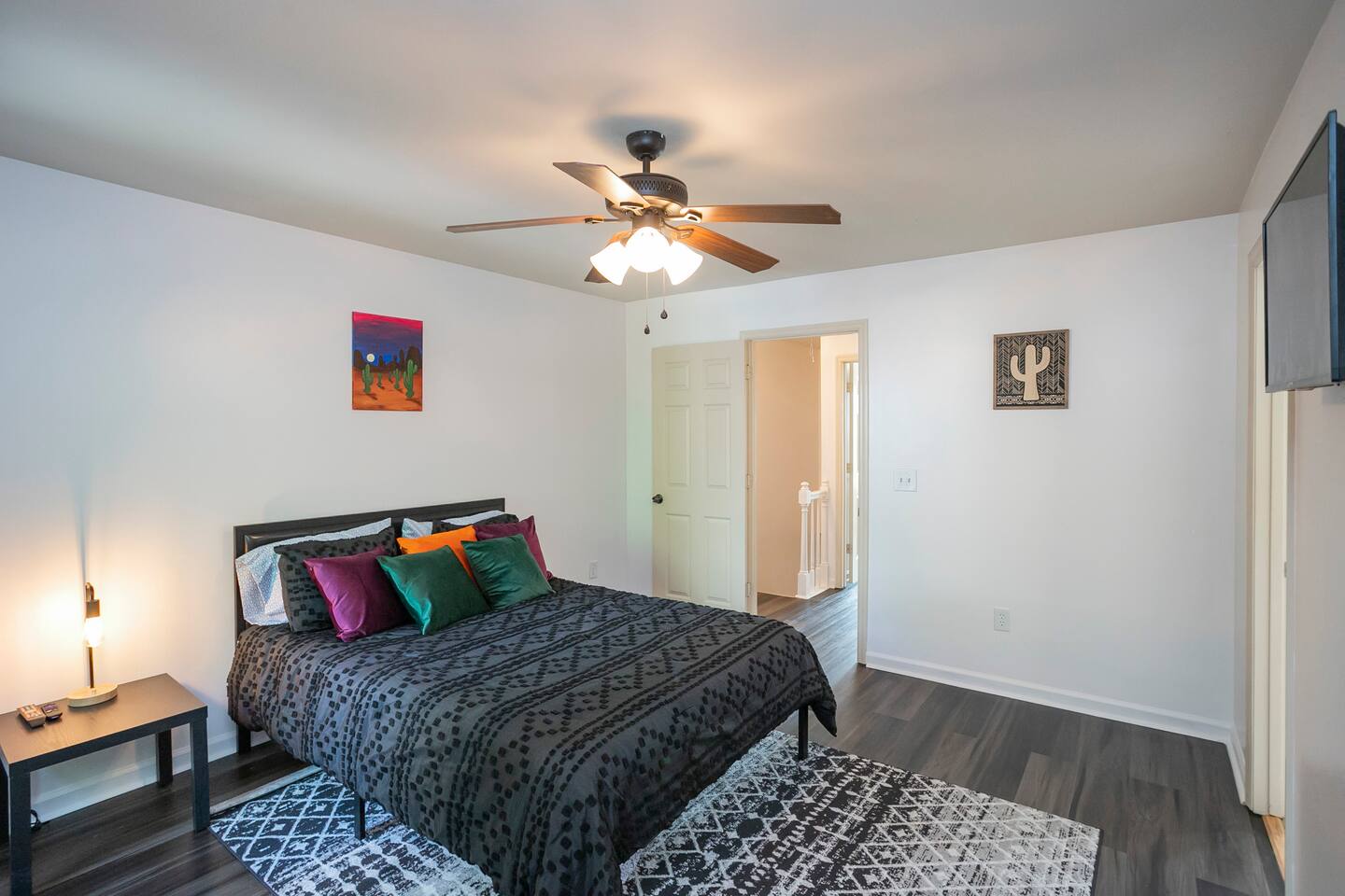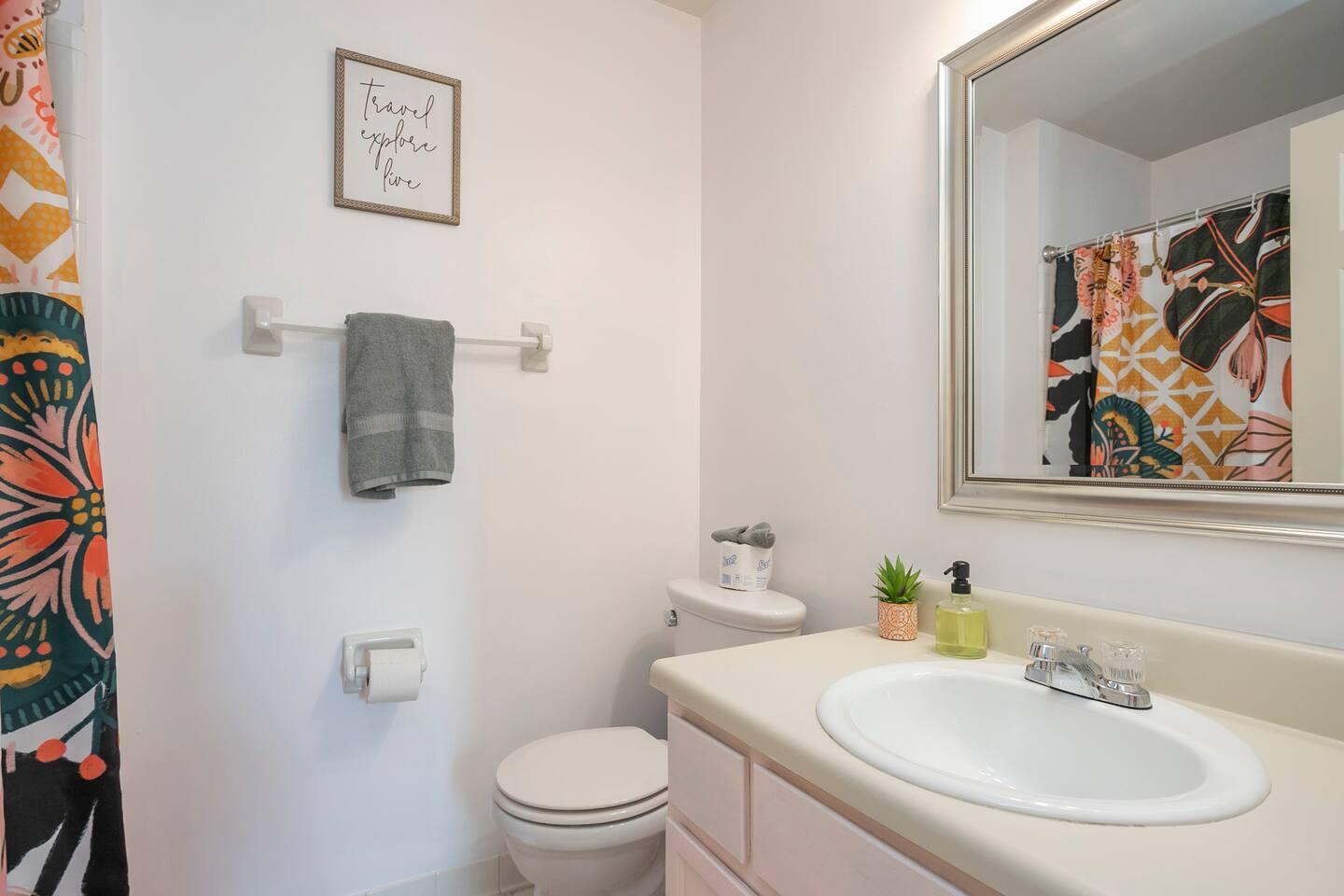 Two Story Townhome with a boho fewl! First Floor: ->Spacious living area w/ twin bed + Roku TV -> 4 person pub table ->half bath ->Full Kitchen Second Floor: ->TWO Queen Bedrooms w/ ensuite baths and closets. Roku TV's too! -> Laundry Outdoor Patio + Games! *please note these townhomes are not new builds, they are from the late 80s and hold some character still from then!
