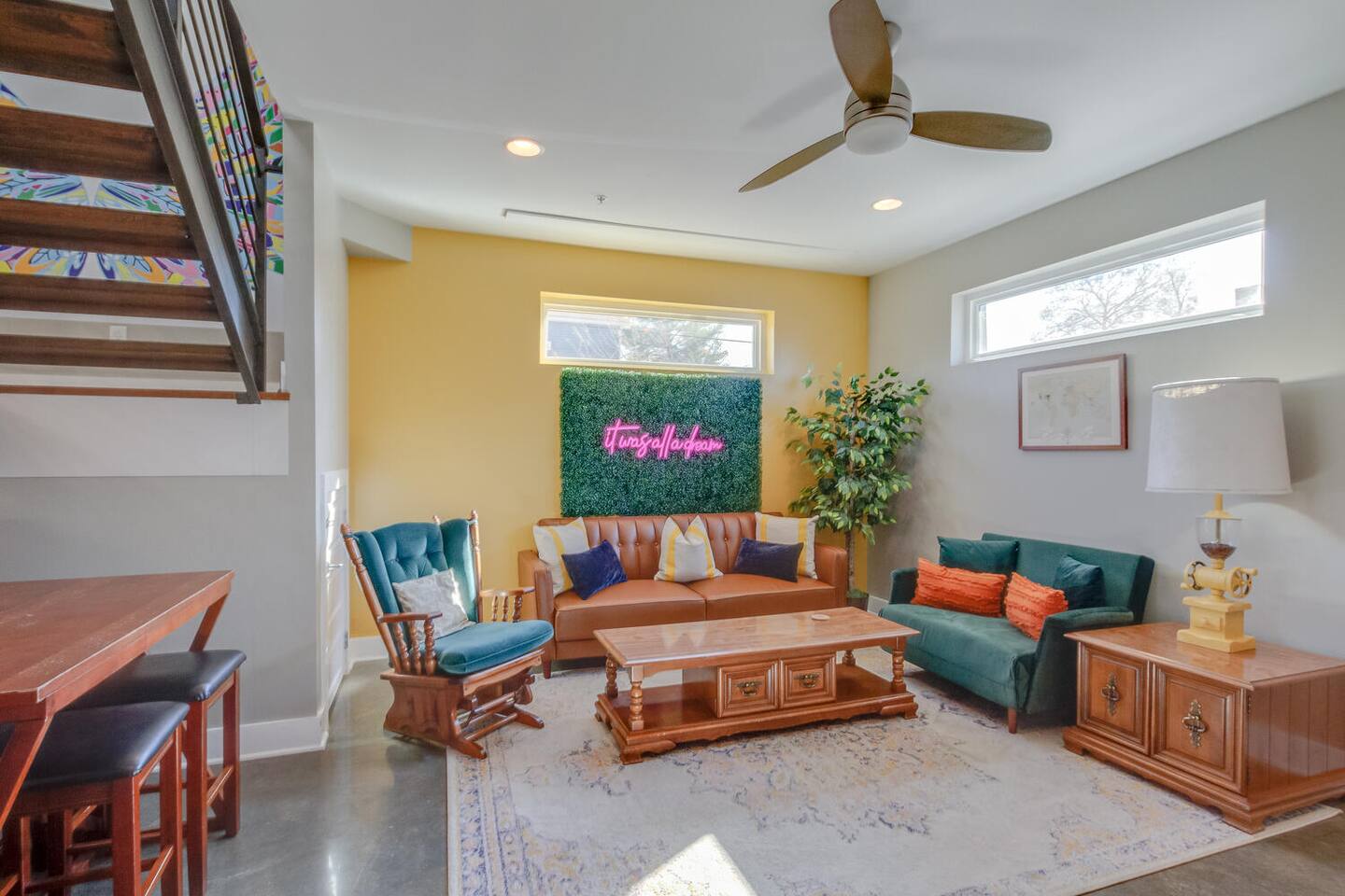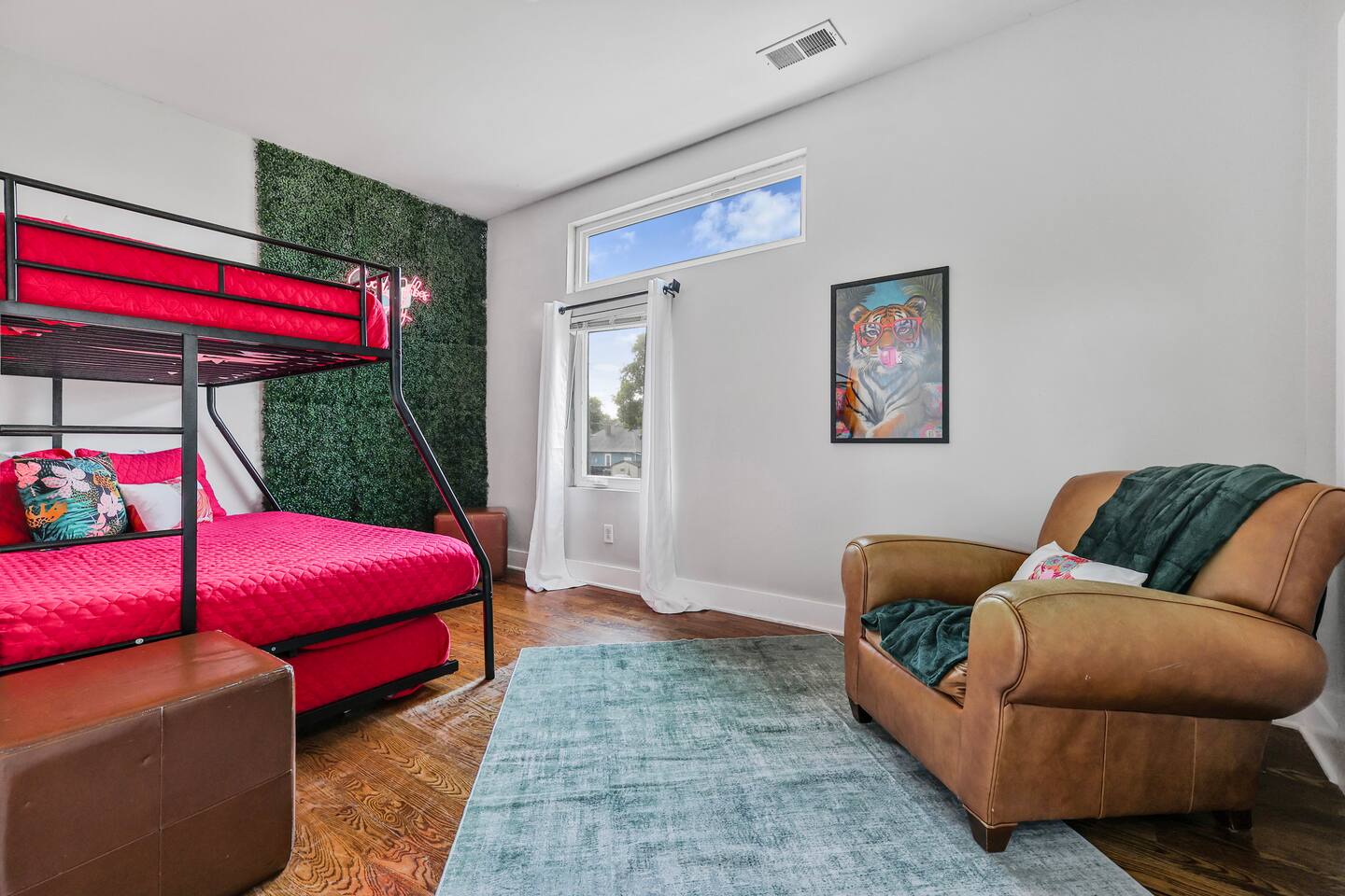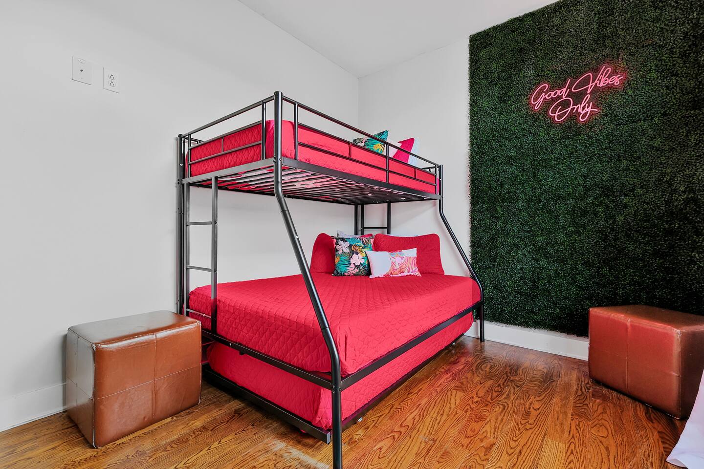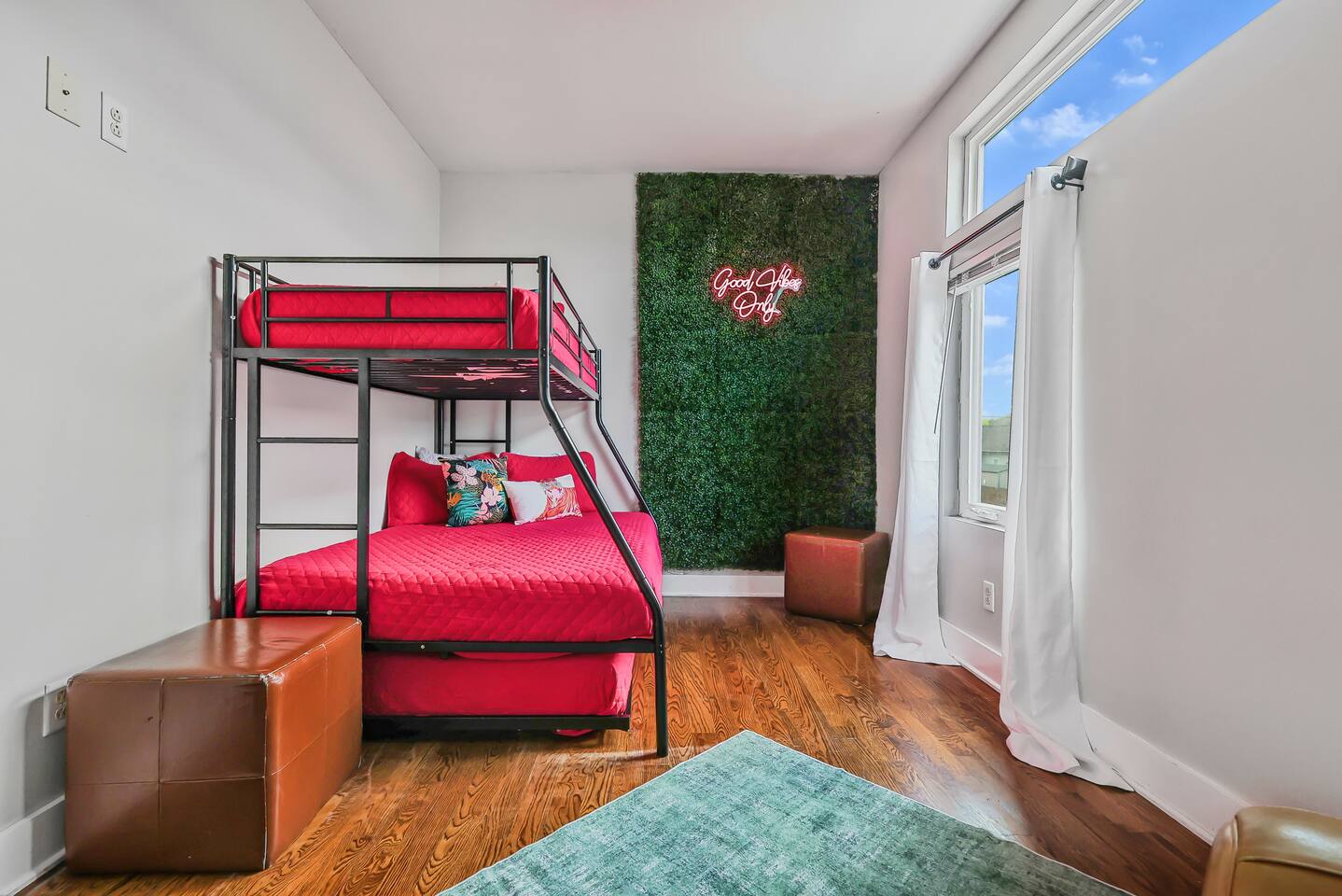 Decorated with your dreams in mind! Music City is full of dreamers + artists alike, feel the vibes! Our Haven! ->Rooftop w/ loungey furniture! ->Full Kitchen ->Living area w/ full size pull out sleeper sofa ->Wifi ->Parking Master Bedroom: ->King size bed Guest Bedroom: ->2 Twin Beds -> One twin trundle able to put on floor **please note right now we are waiting on bunks to come in so it’s not as pictured