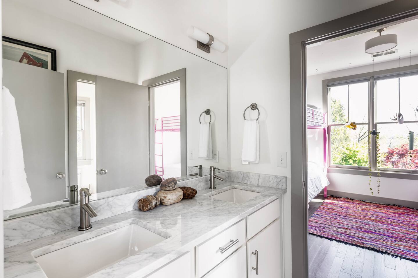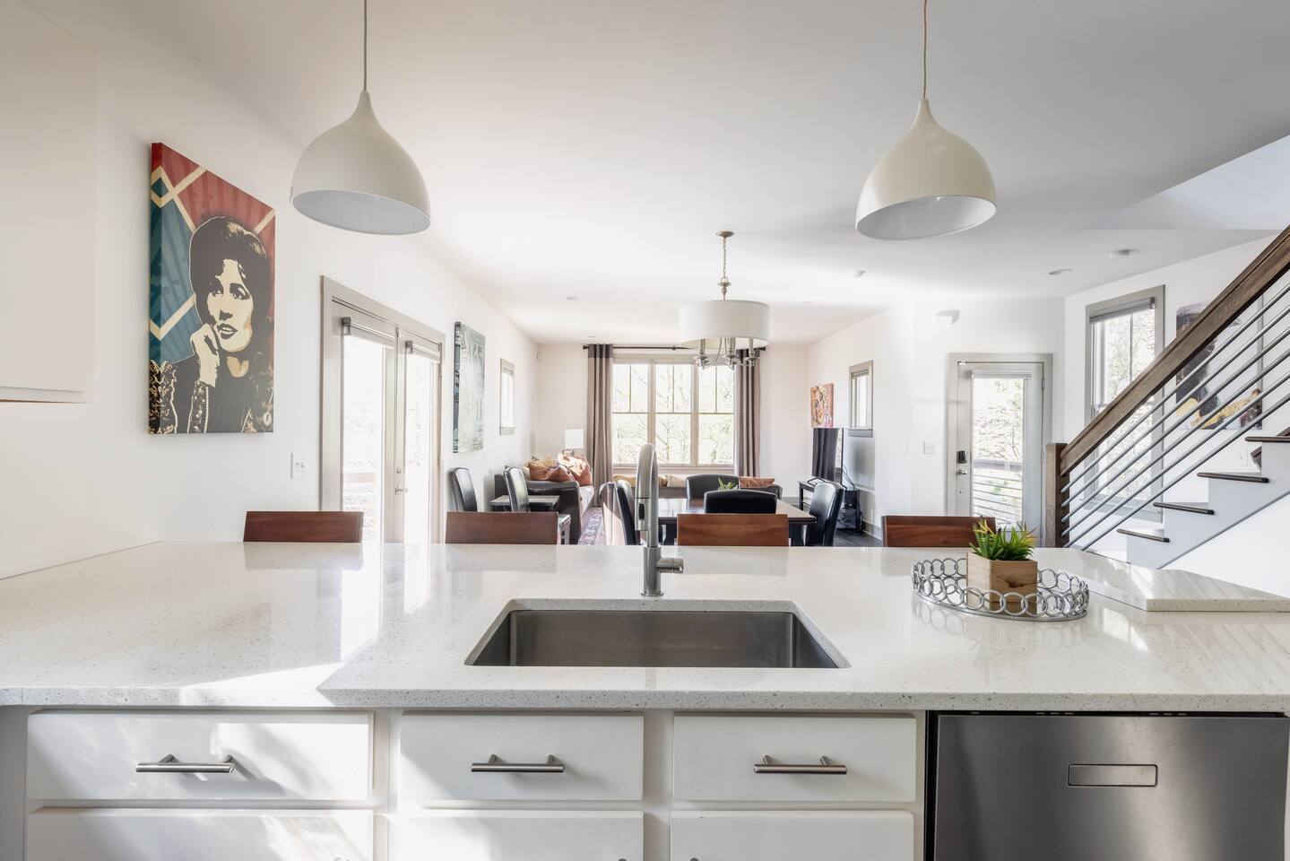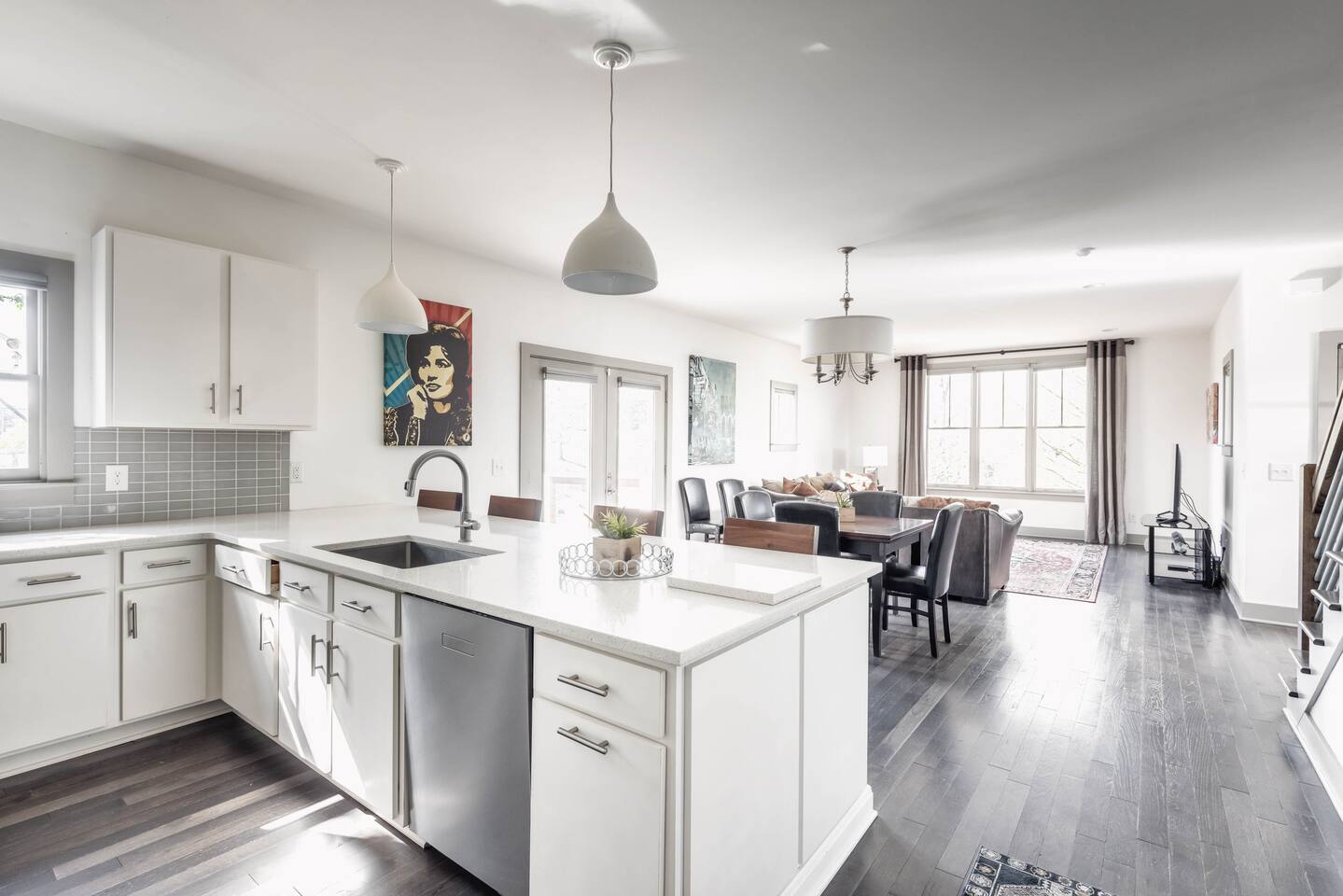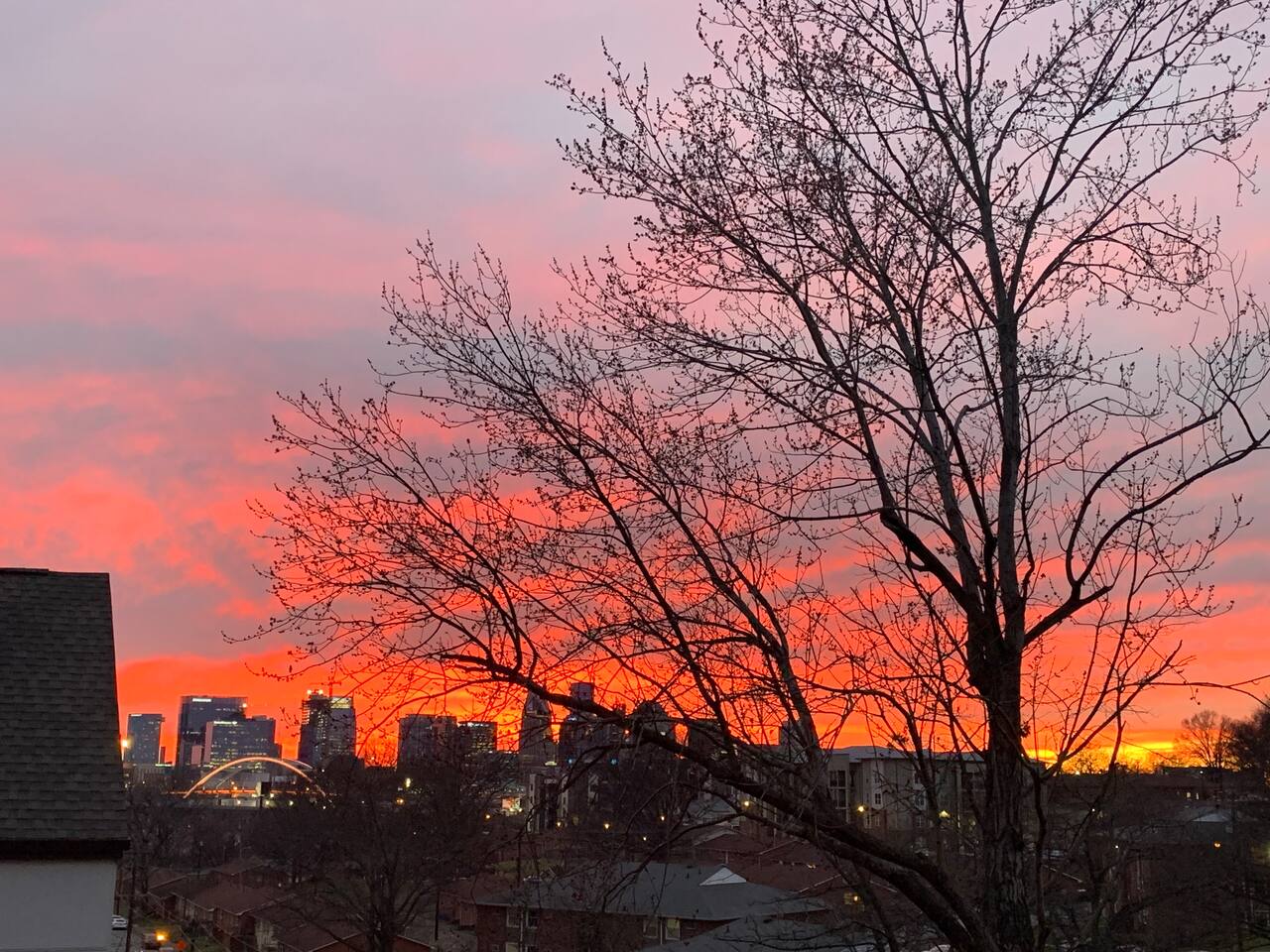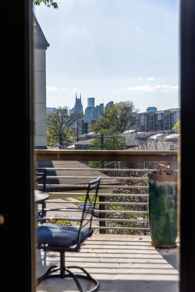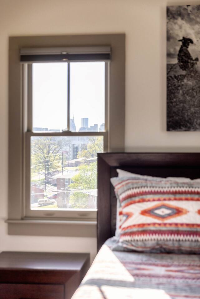 Hang outside enjoying the tranquil nature haven; firepit, outdoor eating area, Adirondack chairs, find your peace + serenity here! When you step inside be reminded you're in Music City y'all! -From Chris Stapleton to Britney Spears you've got the Nashville vibe in every room of this beautiful home. First Floor -> Living area w/ tv -> Full Kitchen -> Dining area -> Half bath **Balcony off the dining area has city skyline views! On 4th of July you have a direct view to the fireworks! Second Floor -> Master bedroom: King Bed ->Master Bath: Shower ->Queen Guest Room ->Full Size beds- Bunk Room -> Full Bathroom for Queen/Twin Room **Outdoor Nature Haven + Patio! **Parking for 2 cars outside our gate + extra street parking!
