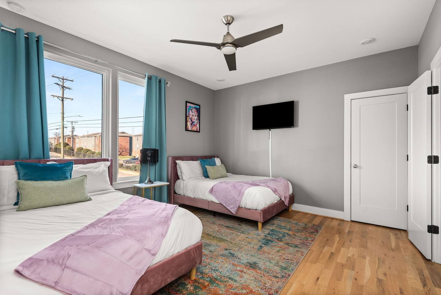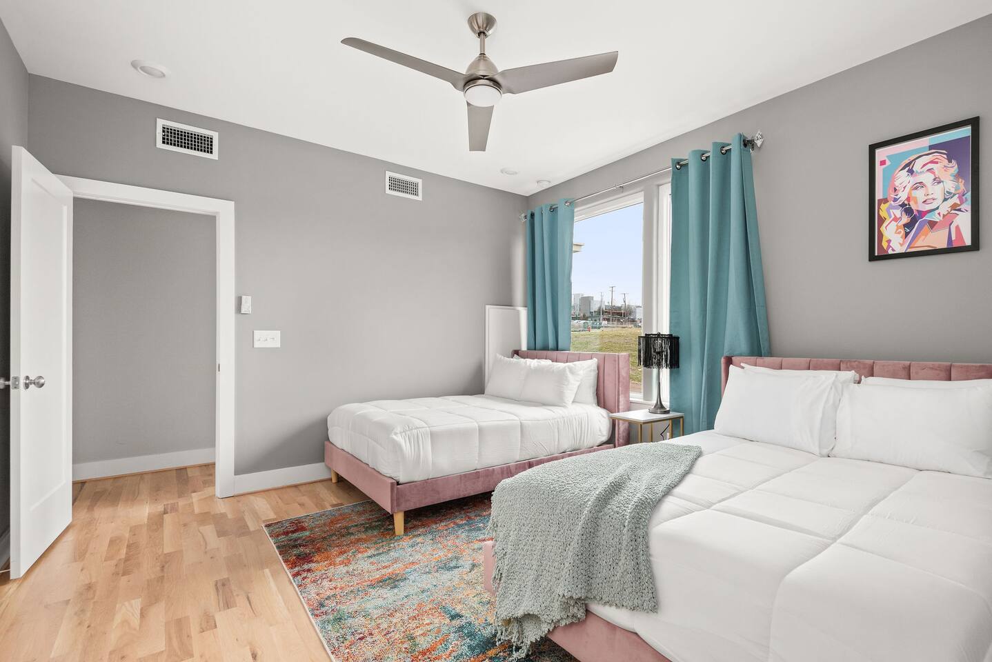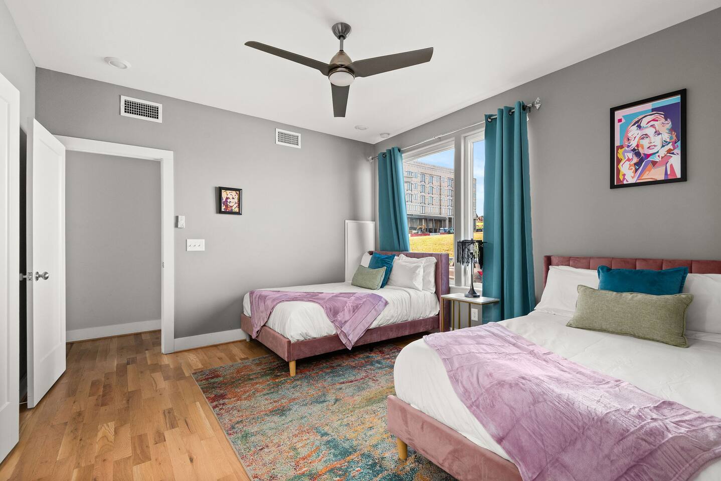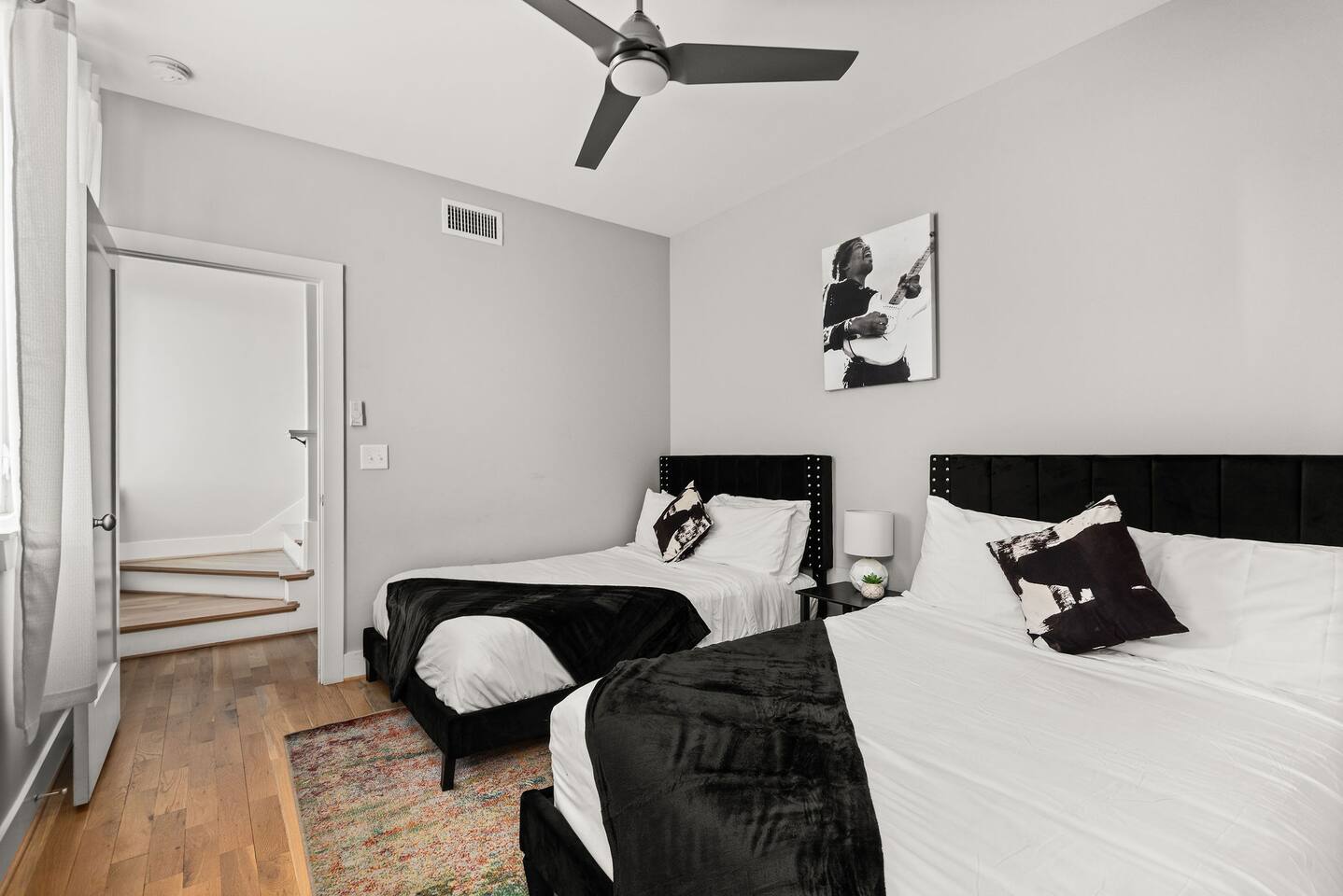 The Layout: - First Floor: Bedroom with 2 Queen Beds + Ensuite Full Bath -Main Floor: Full Kitchen, Dining Area, Living Room with Smart TV + Half Bath -Third Floor: Bedroom with 2 Queen Beds + Ensuite Bath •-Third Floor: Bedroom with 1 King Bed + Full Bath Enjoy the spacious rooftop with your friends + family in the mornings, evenings or all day! Catch the sunrise + the sunset! Garage parking available + street parking also! This property is fully equipped and ready to make your trip to Music City memorable + convienient.