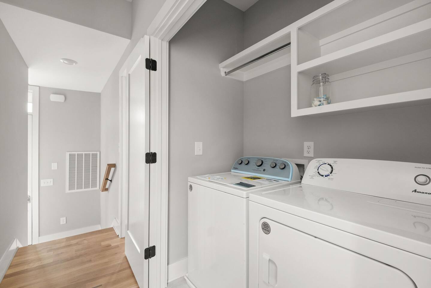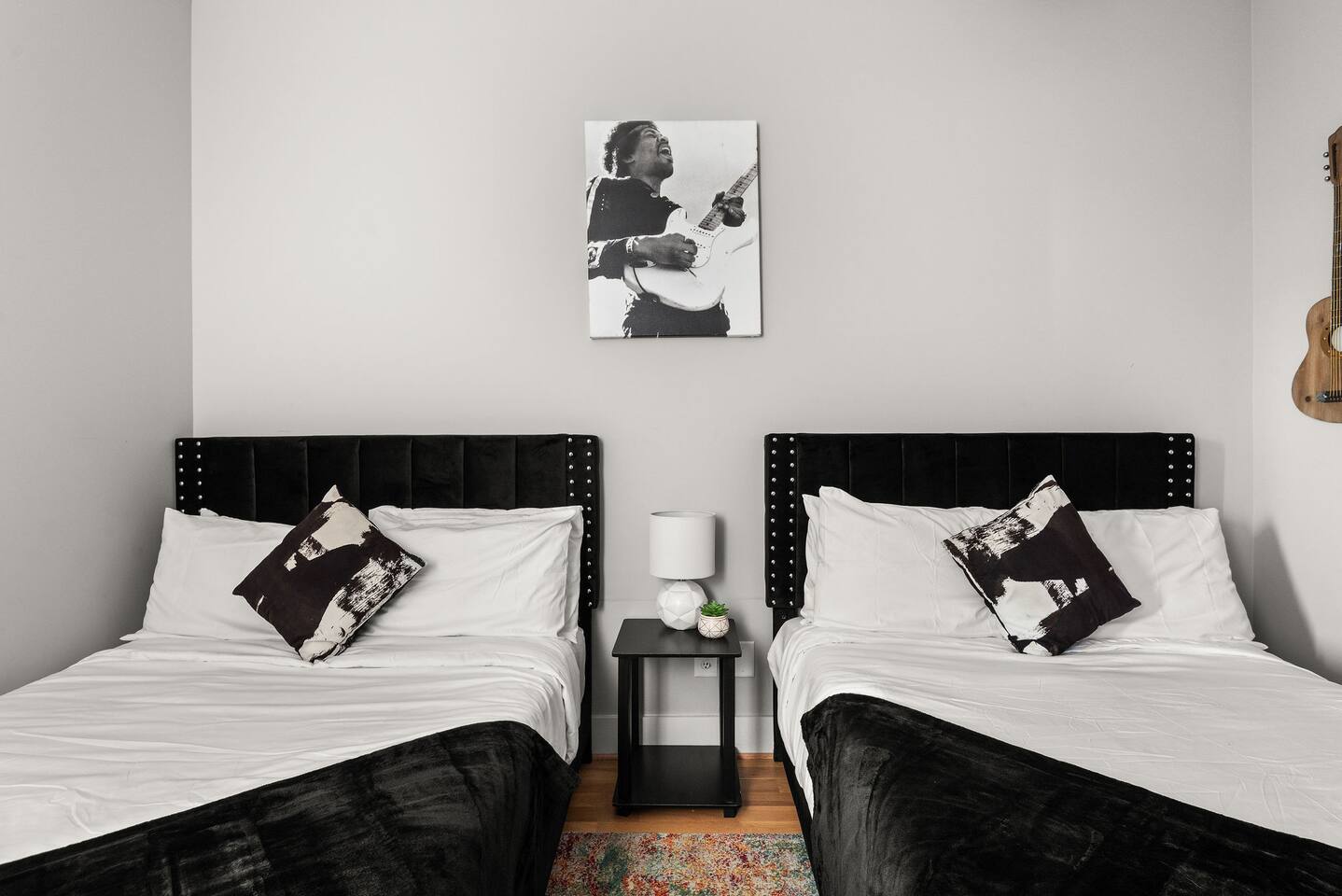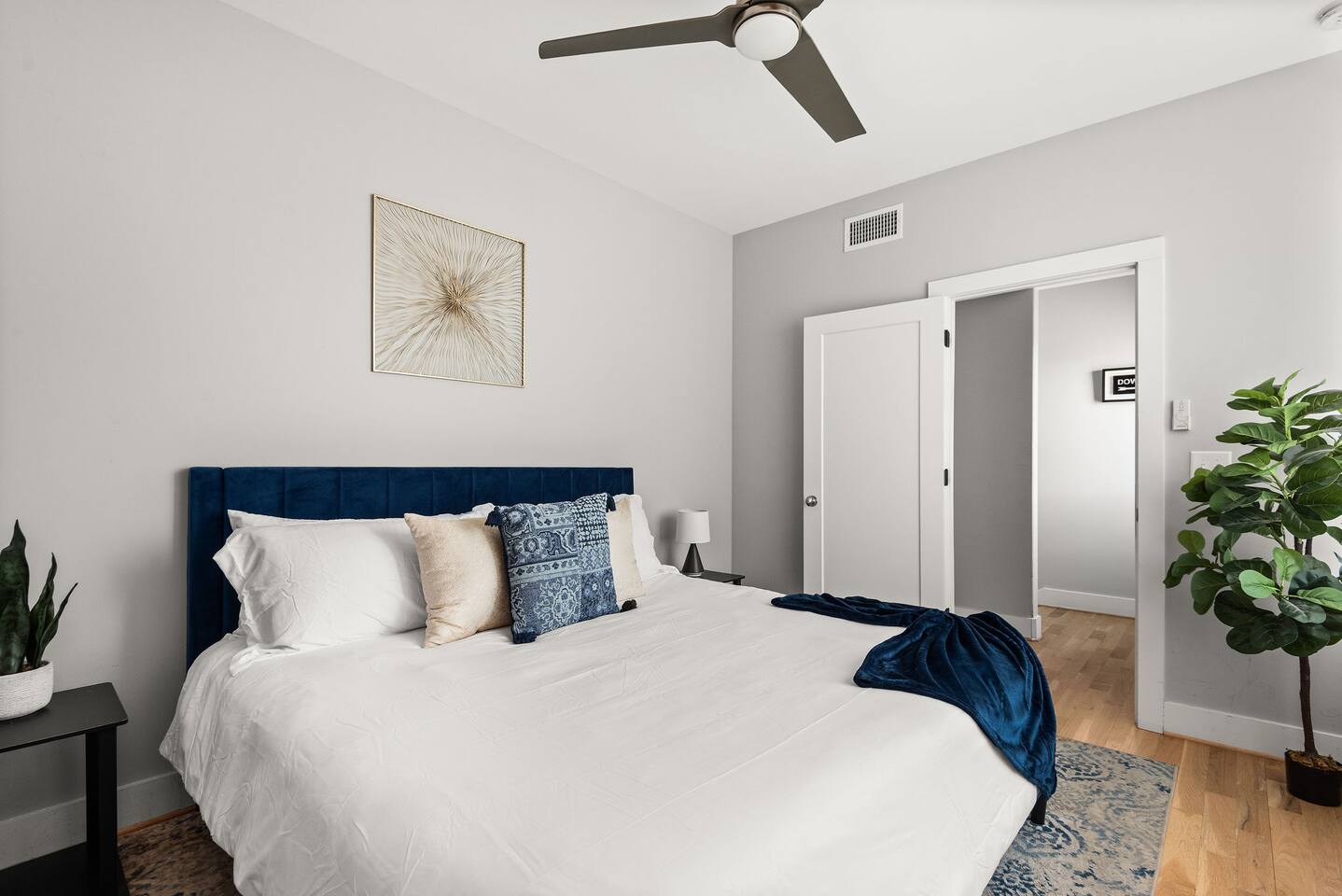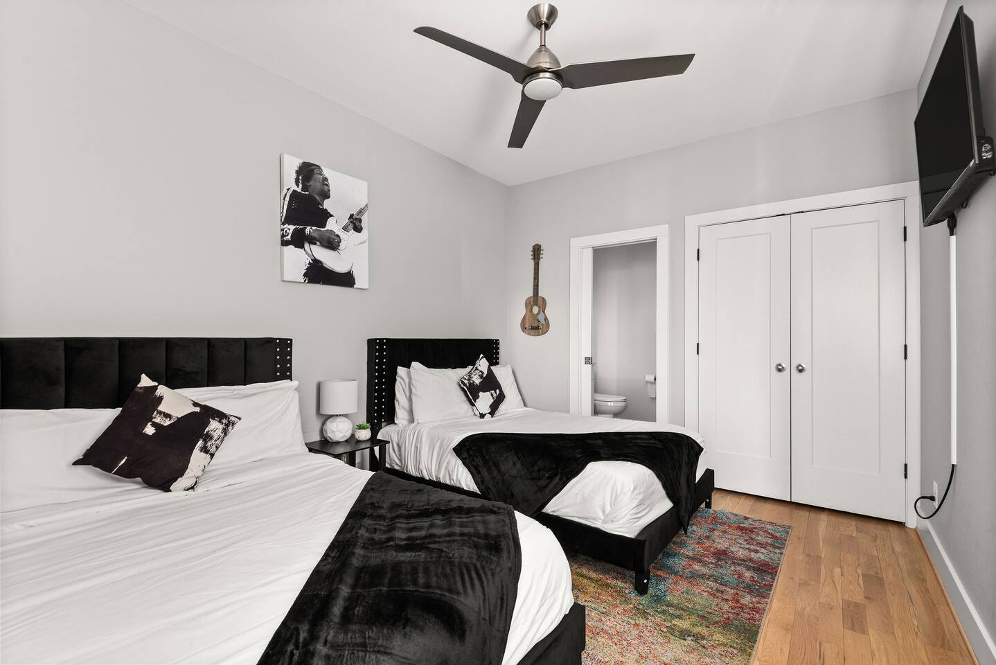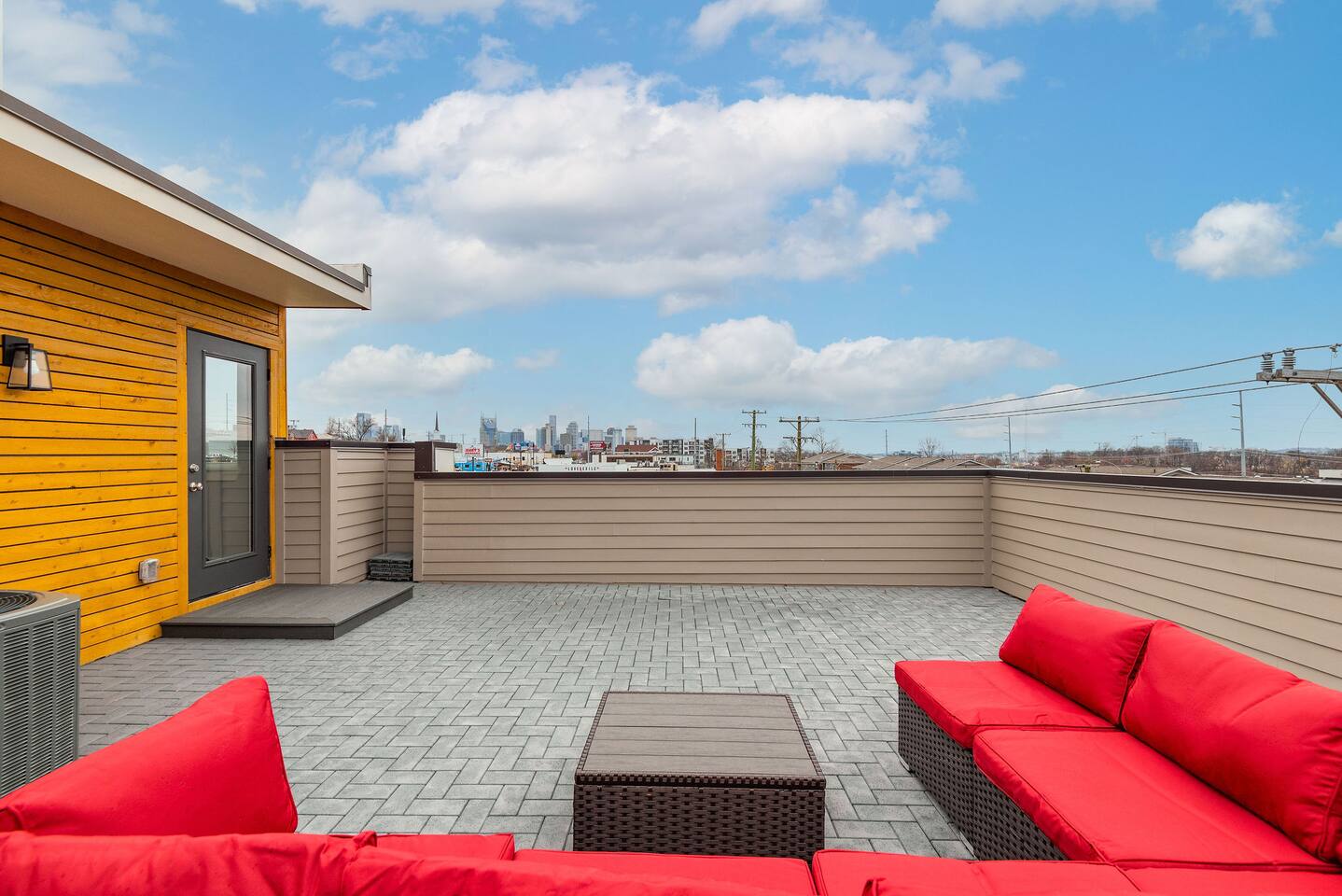 The Layout: - First Floor: Bedroom with 2 Queen Beds + Ensuite Full Bath -Main Floor: Full Kitchen, Dining Area, Living Room with Smart TV + Half Bath -Third Floor: Bedroom with 2 Queen Beds + Ensuite Bath •-Third Floor: Bedroom with 1 King Bed + Full Bath Enjoy the spacious rooftop with your friends + family in the mornings, evenings or all day! Catch the sunrise + the sunset! Garage parking available + street parking also! This property is fully equipped and ready to make your trip to Music City memorable + convienient.