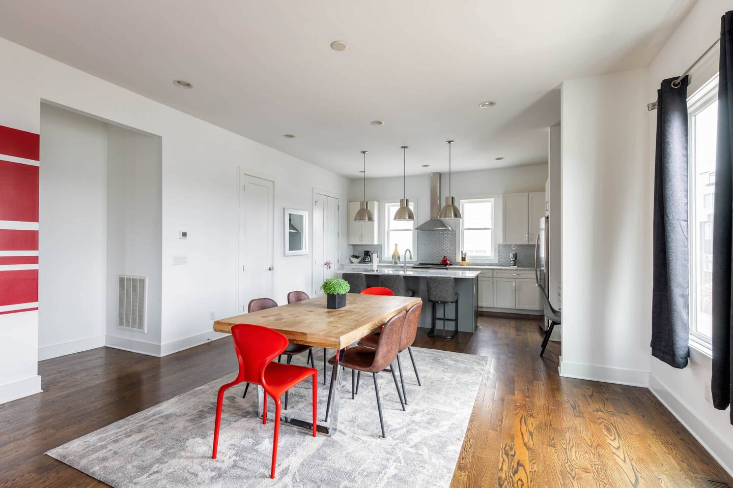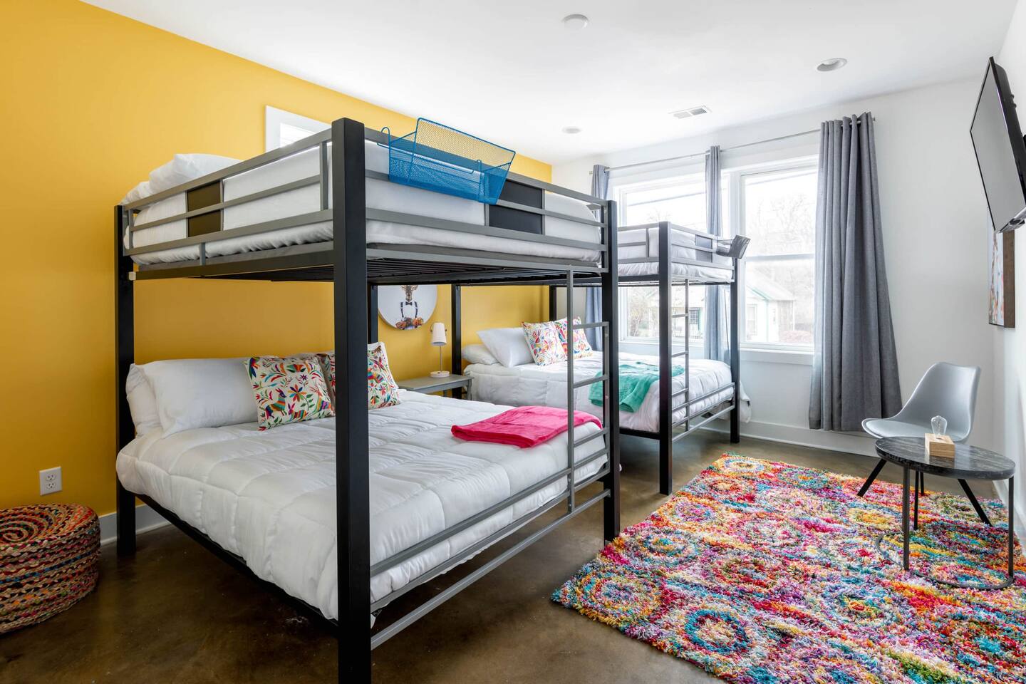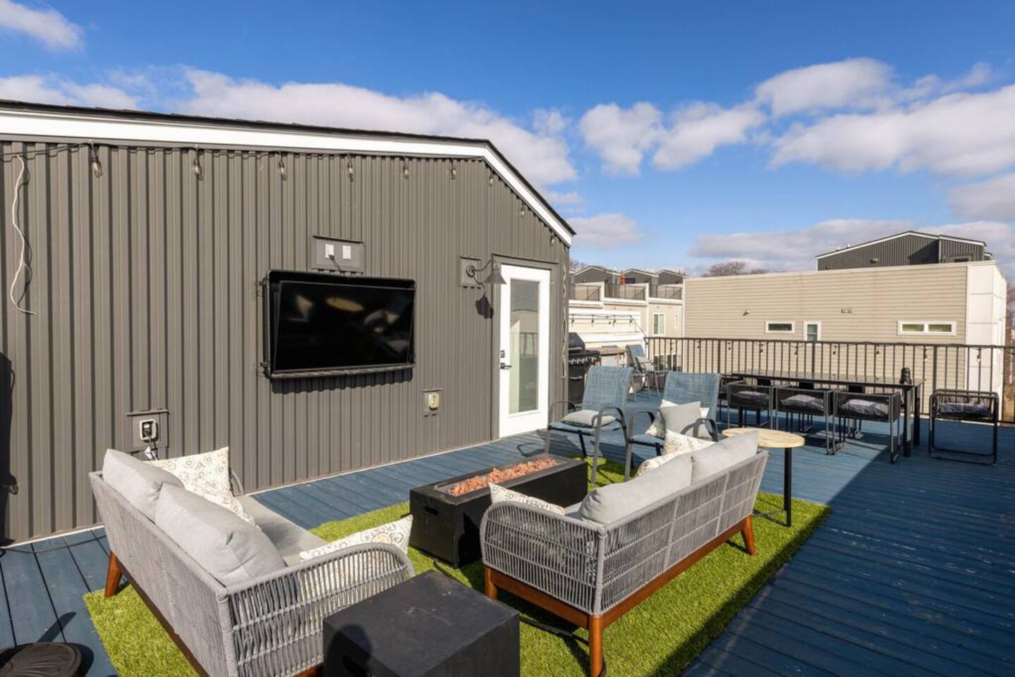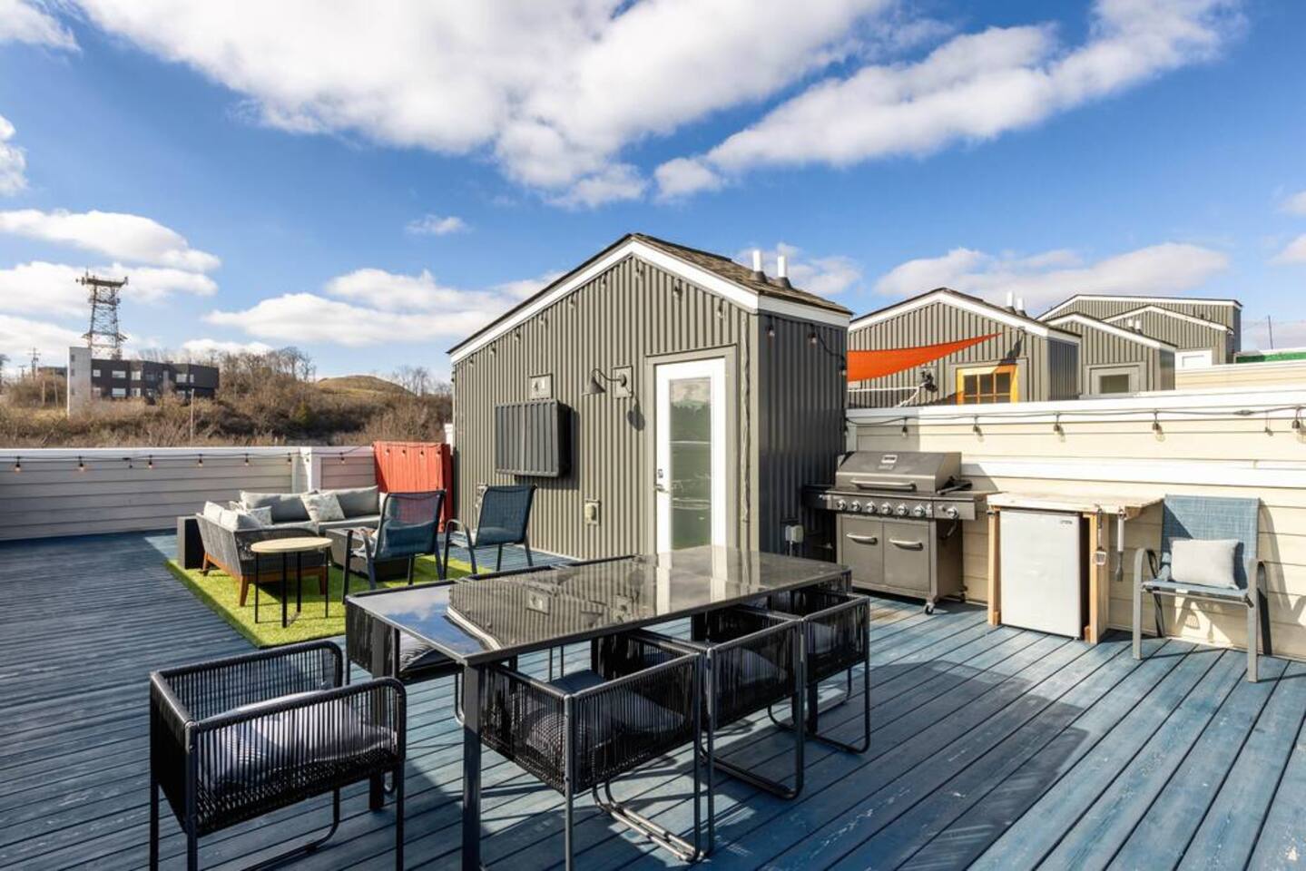 First Floor -> -Full Bathroom -Queen Bunk Room (4 beds) -Smart TV Main Floor -> -Living area w/ Smart TV -Dining table for 6-8 -Full Kitchen -Half Bath Third Floor -> -King Bedroom w. ensuite bath -Queen Bedroom w. ensuite bath ROOFTOP! -Views, views, views -Dining table -Mini Fridge -Lounge Garage parking for one car, small parking lot for the complex and street parking! -> Each room comes with its own ensuite bathroom you can enjoy the luxury of having your own personal space to unwind and relax. From fully equipped kitchens to cozy living areas, you'll have everything you need to feel right at home!
