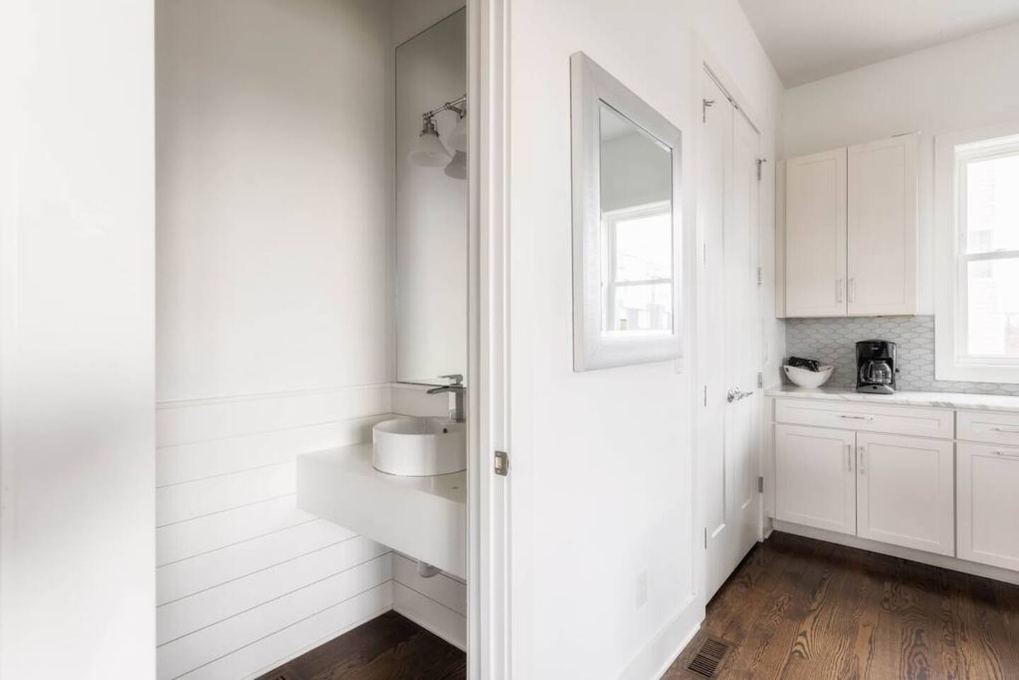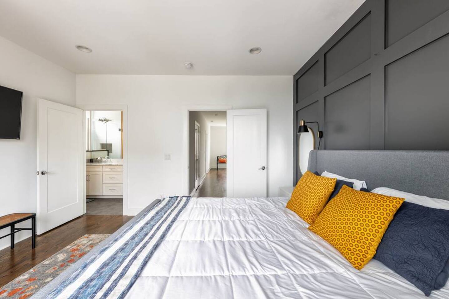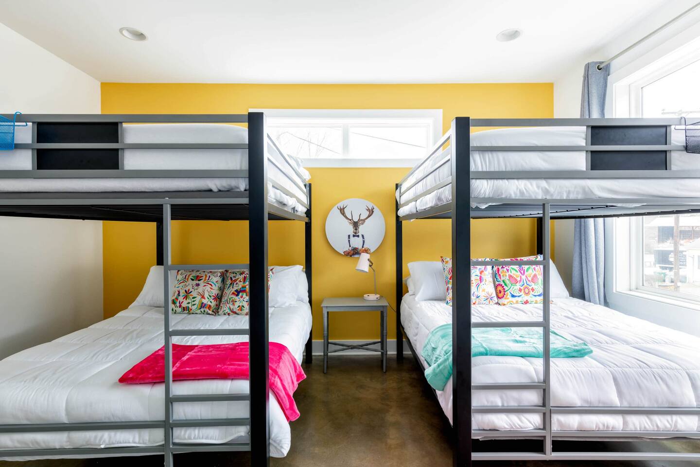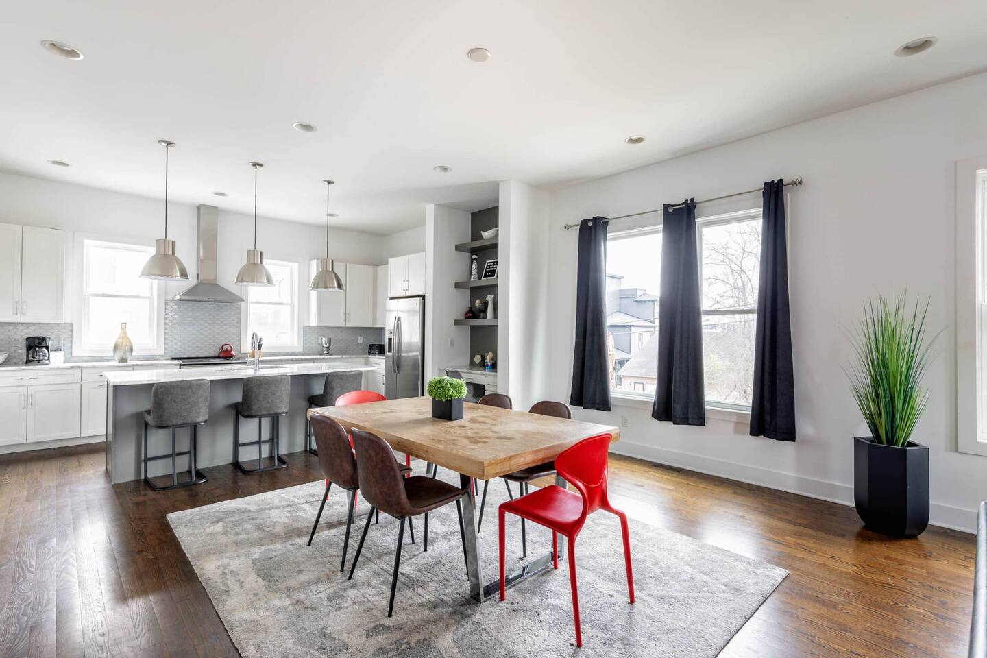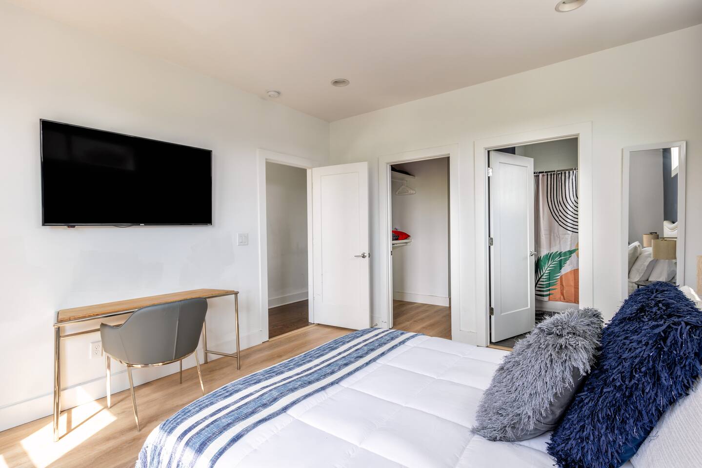 First Floor -> -Full Bathroom -Queen Bunk Room (4 beds) -Smart TV Main Floor -> -Living area w/ Smart TV -Dining table for 6-8 -Full Kitchen -Half Bath Third Floor -> -King Bedroom w. ensuite bath -Queen Bedroom w. ensuite bath ROOFTOP! -Views, views, views -Dining table -Mini Fridge -Lounge Garage parking for one car, small parking lot for the complex and street parking! -> Each room comes with its own ensuite bathroom you can enjoy the luxury of having your own personal space to unwind and relax. From fully equipped kitchens to cozy living areas, you'll have everything you need to feel right at home!