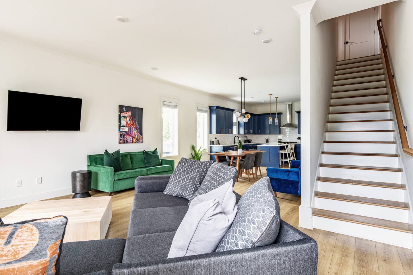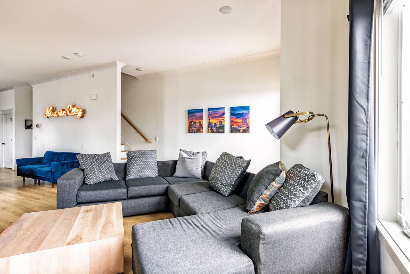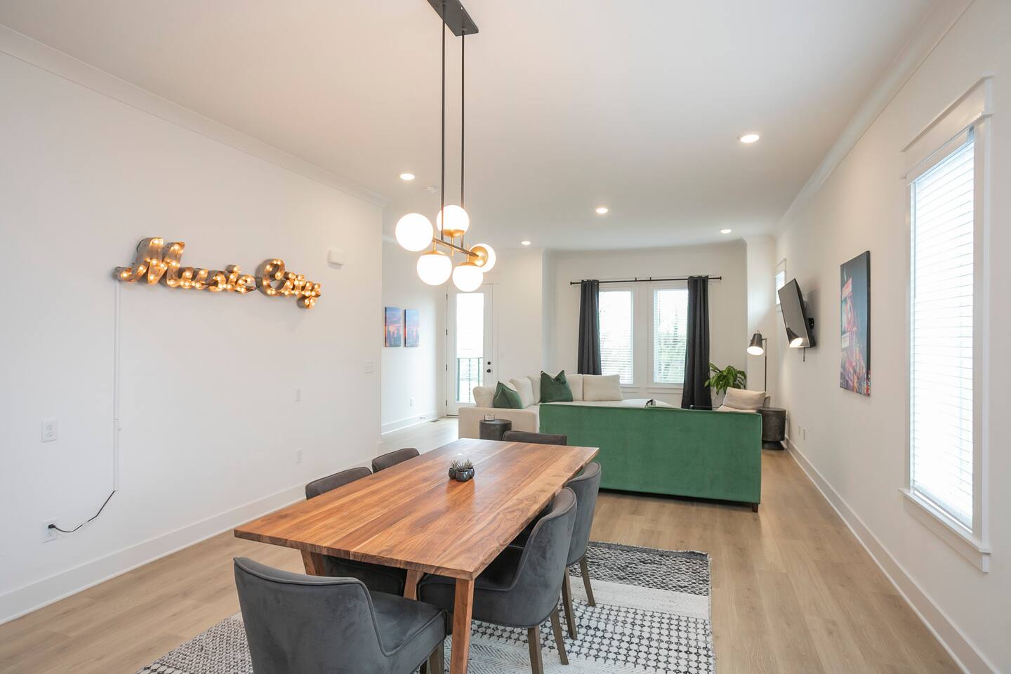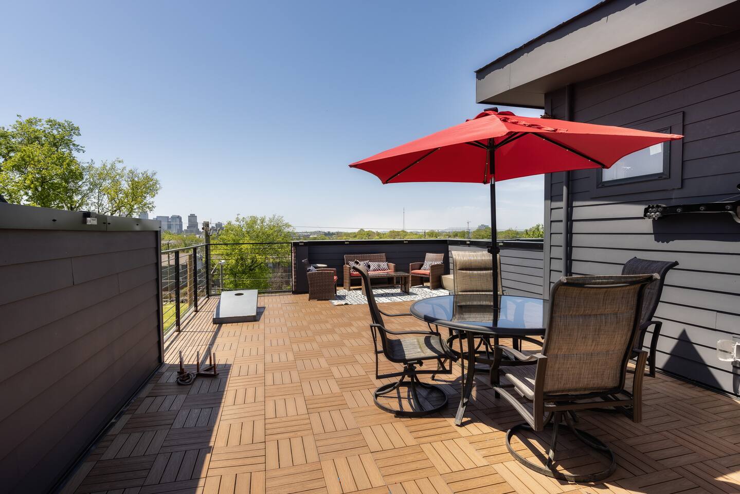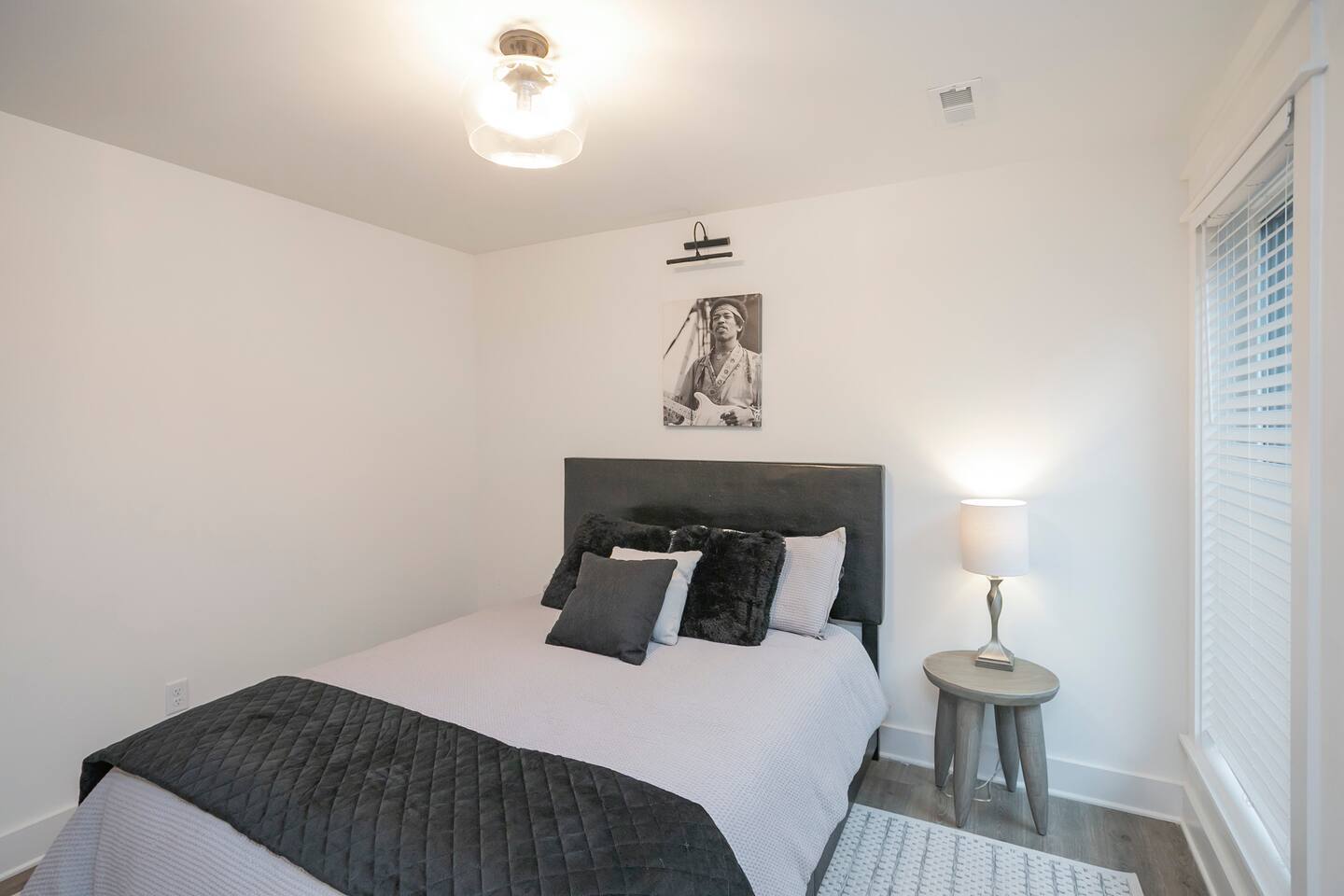 "Rock + Roll Haven" Rock + Roll Haven: 1st Floor: ->"the Bowie" Queen bed + Roku TV ->Shared bath (shower only) ->"the Hendrix" Queen Bed 2nd Floor: ->Main Living Area w/ 2 fold out queen sleeper sofas ->full kitchen ->6 person dining 3rd Floor: ->"icons of the 90s" Queen bed + ensuite bath ->"the Beatles" Master King bed w/ Roku TV + ensuite bath Rooftop! ->Enjoy the birds eye view to downtown! You can see the city line clearly. ->Cornhole, Ring Toss, Darts to play ------ "The Nash Local" The artwork in the unit is all local artists! We love to support our friends and community. Try the local Nash coffees we have also! ✔️The first floor has two queen bedrooms and one bath. ✔️Take the flight of stairs up to the main quarters and you’ll find a fully equipped chefs kitchen, a six person designer wood table to dine, and an expansive living area. ✔️Take the next flight of stairs up to the third-floor where you will find a queen bedroom with a bathroom, a king master with an en suite bathroom. ✔️Take some selfie‘s or group photos in front of our Nashville selfie wall! ✔️Enjoy the rooftop feels and views as you make your way to the fourth floor. Here you can enjoy a game of cod hole or ring toss!