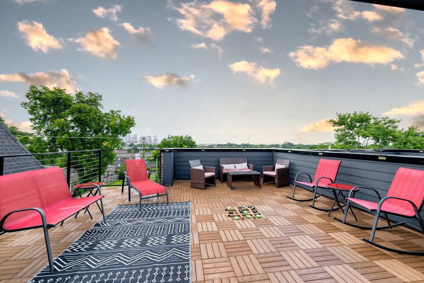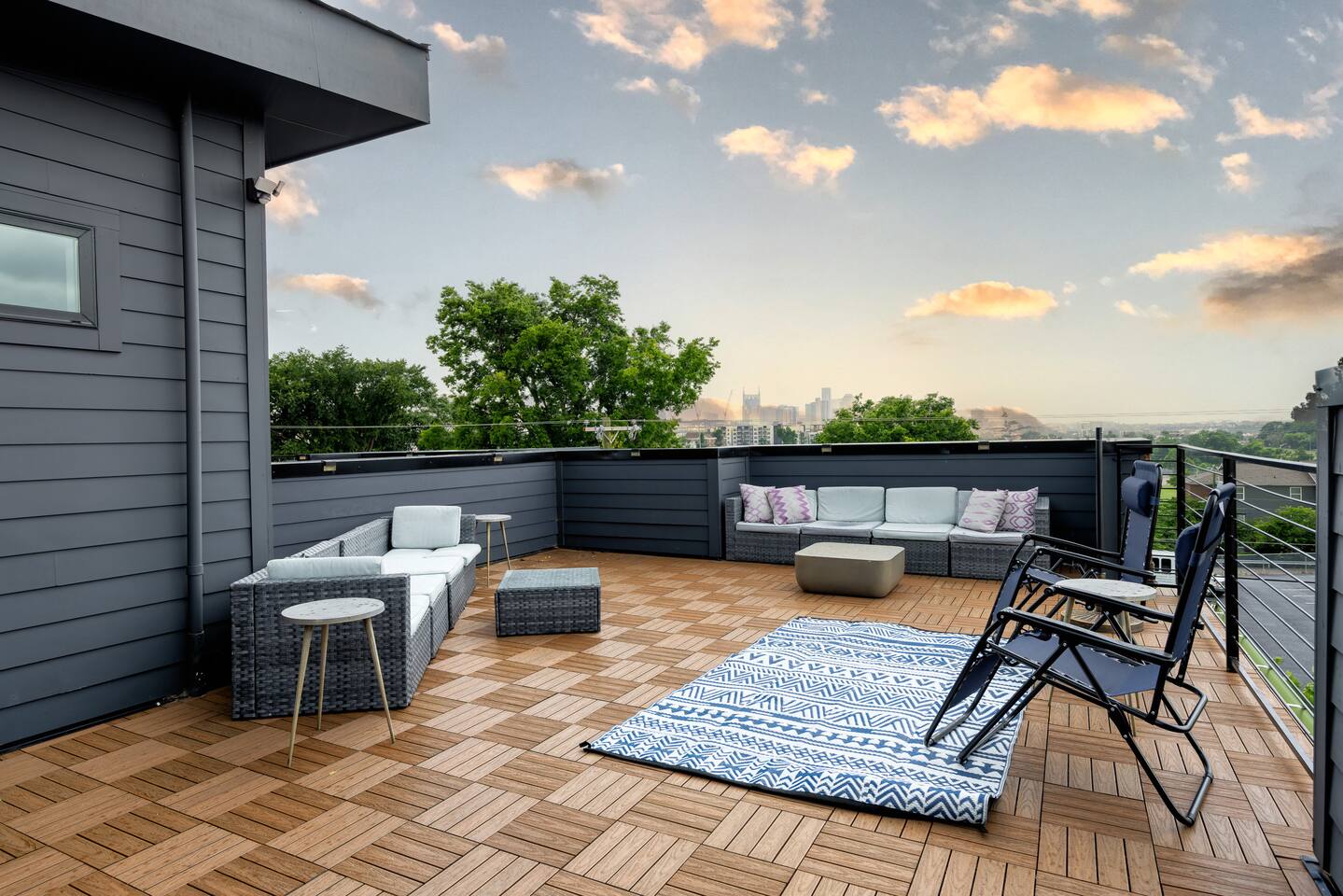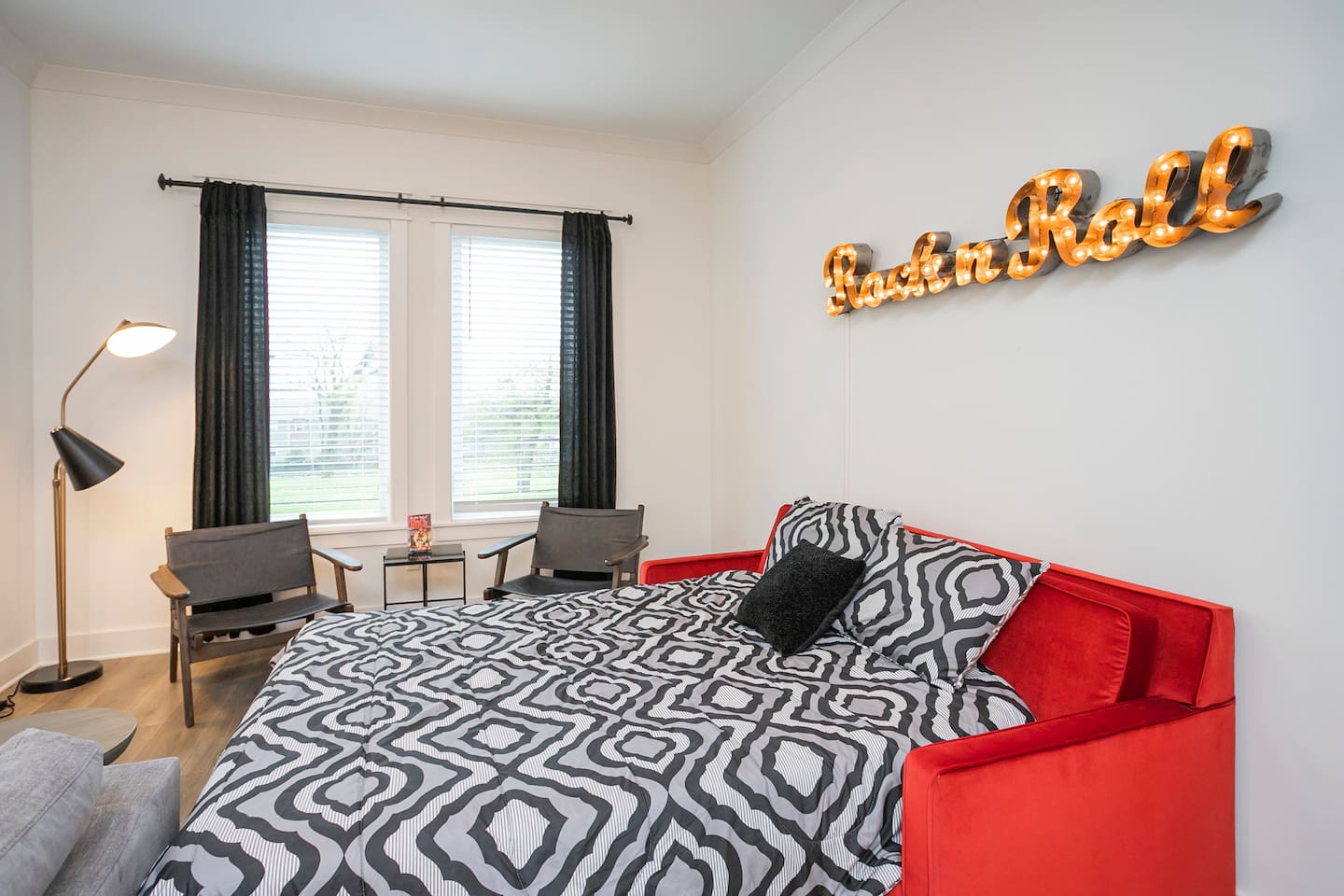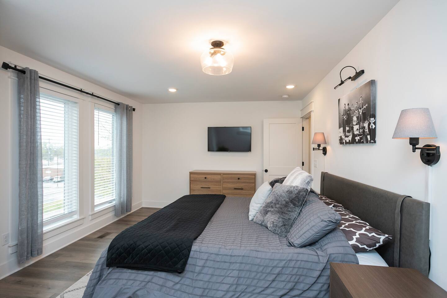 "Rock + Roll Haven" Rock + Roll Haven: 1st Floor: ->"the Bowie" Queen bed + Roku TV ->Shared bath (shower only) ->"the Hendrix" Queen Bed 2nd Floor: ->Main Living Area w/ 2 fold out queen sleeper sofas ->full kitchen ->6 person dining 3rd Floor: ->"icons of the 90s" Queen bed + ensuite bath ->"the Beatles" Master King bed w/ Roku TV + ensuite bath Rooftop! ->Enjoy the birds eye view to downtown! You can see the city line clearly. ->Cornhole, Ring Toss, Darts to play ------ "The Nash Local" The artwork in the unit is all local artists! We love to support our friends and community. Try the local Nash coffees we have also! ✔️The first floor has two queen bedrooms and one bath. ✔️Take the flight of stairs up to the main quarters and you’ll find a fully equipped chefs kitchen, a six person designer wood table to dine, and an expansive living area. ✔️Take the next flight of stairs up to the third-floor where you will find a queen bedroom with a bathroom, a king master with an en suite bathroom. ✔️Take some selfie‘s or group photos in front of our Nashville selfie wall! ✔️Enjoy the rooftop feels and views as you make your way to the fourth floor. Here you can enjoy a game of cod hole or ring toss!