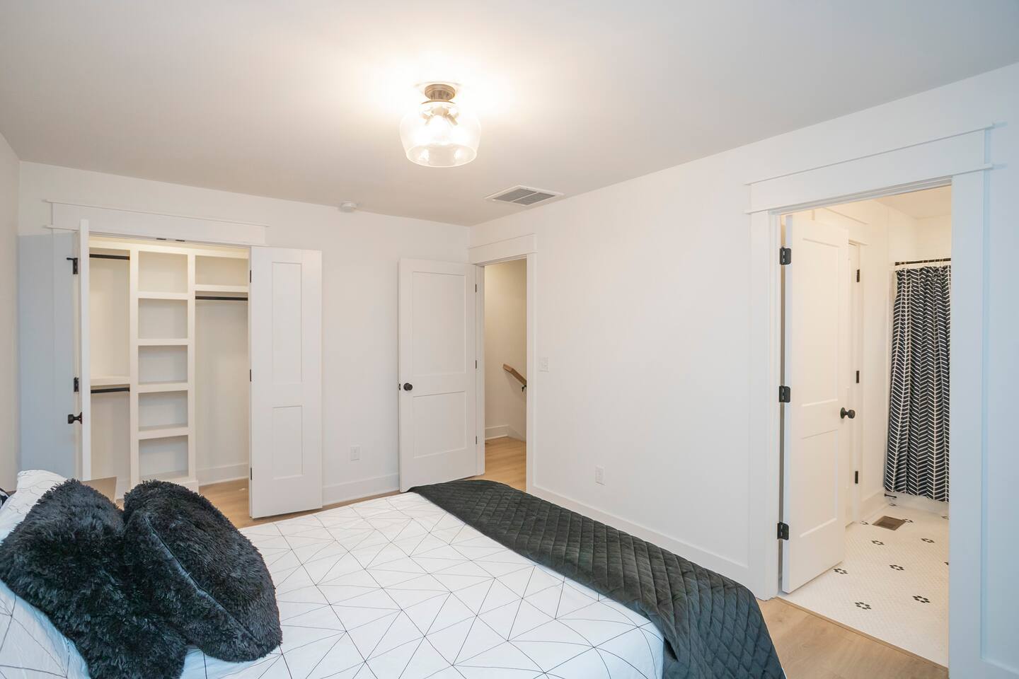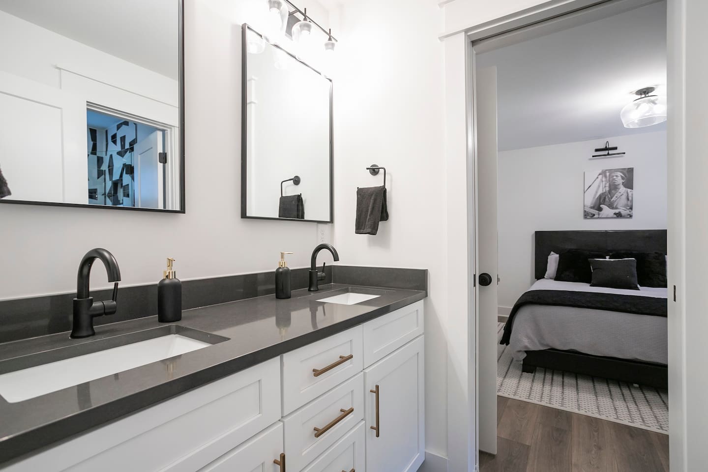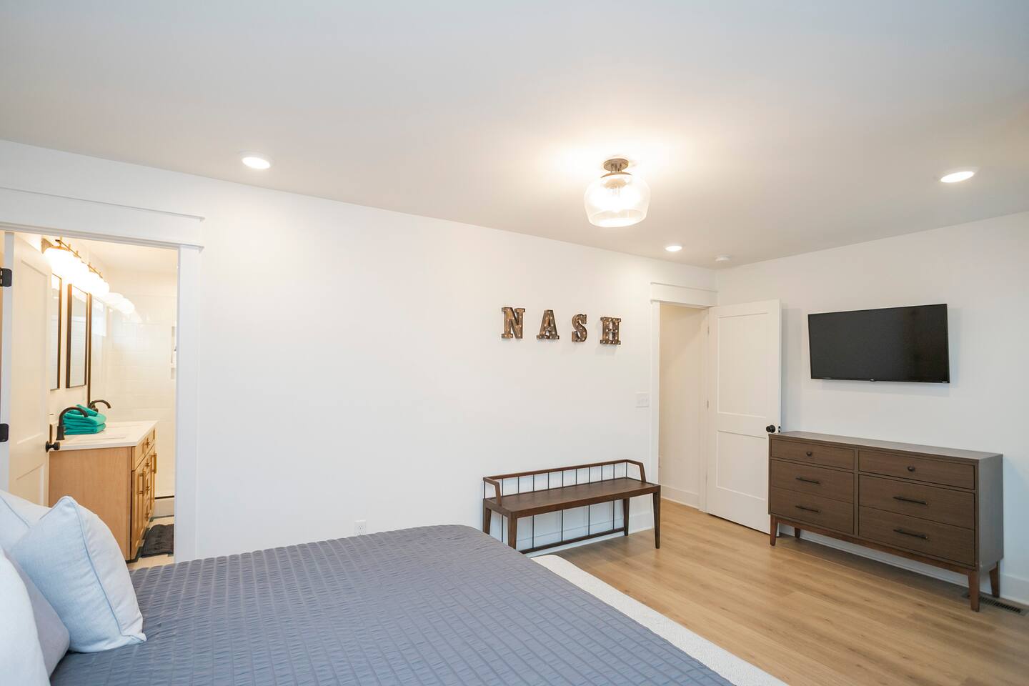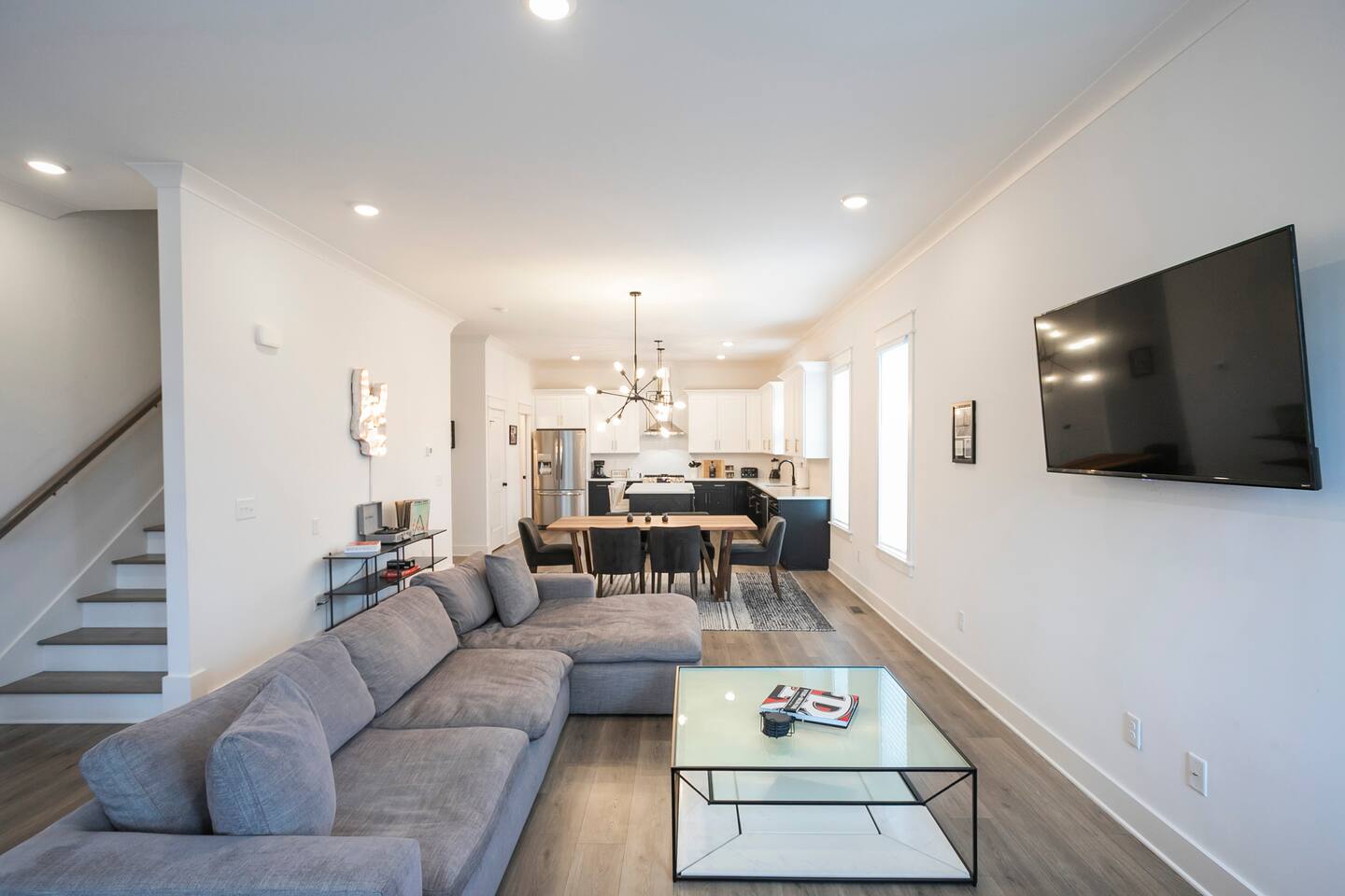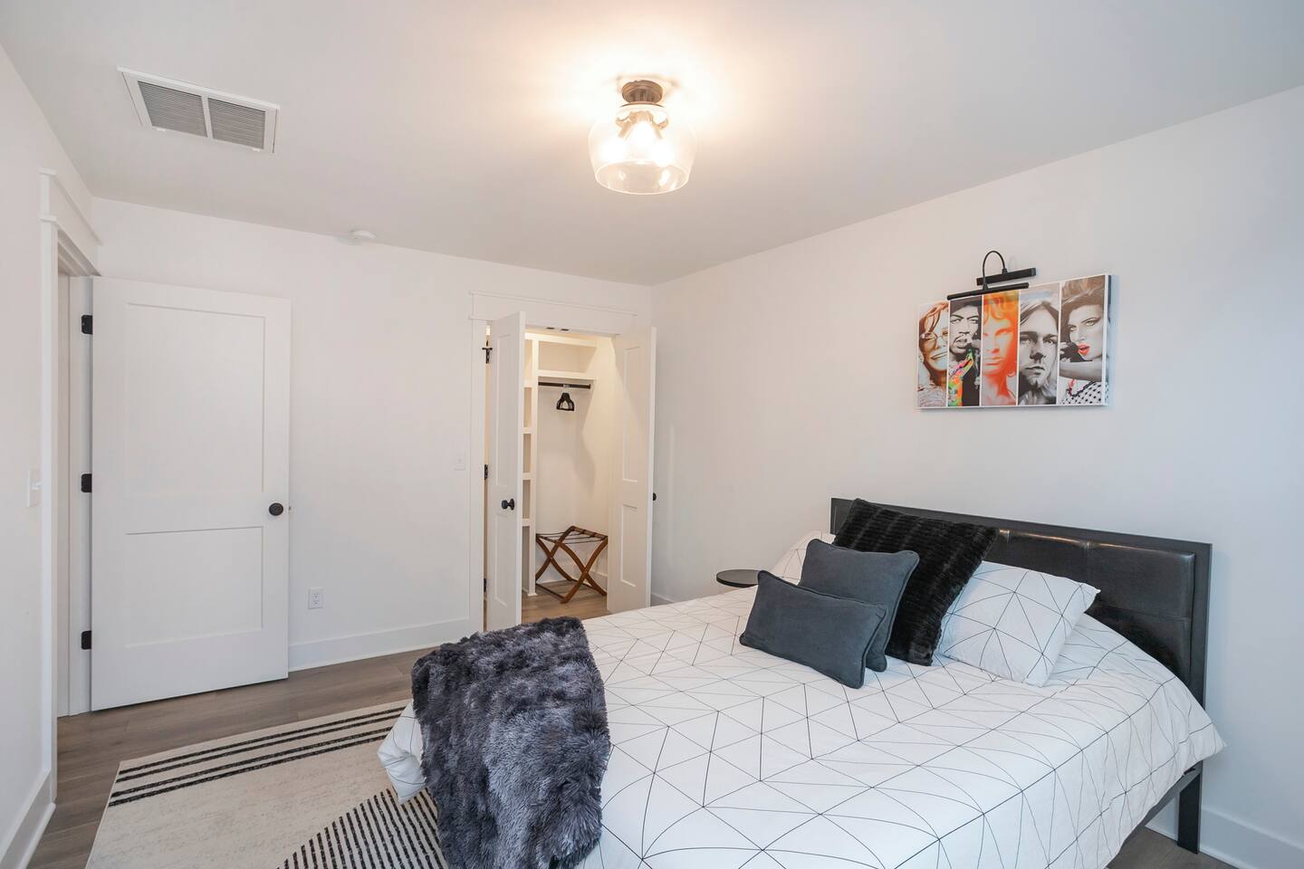 "Rock + Roll Haven" Rock + Roll Haven: 1st Floor: ->"the Bowie" Queen bed + Roku TV ->Shared bath (shower only) ->"the Hendrix" Queen Bed 2nd Floor: ->Main Living Area w/ 2 fold out queen sleeper sofas ->full kitchen ->6 person dining 3rd Floor: ->"icons of the 90s" Queen bed + ensuite bath ->"the Beatles" Master King bed w/ Roku TV + ensuite bath Rooftop! ->Enjoy the birds eye view to downtown! You can see the city line clearly. ->Cornhole, Ring Toss, Darts to play ------ "The Nash Local" The artwork in the unit is all local artists! We love to support our friends and community. Try the local Nash coffees we have also! ✔️The first floor has two queen bedrooms and one bath. ✔️Take the flight of stairs up to the main quarters and you’ll find a fully equipped chefs kitchen, a six person designer wood table to dine, and an expansive living area. ✔️Take the next flight of stairs up to the third-floor where you will find a queen bedroom with a bathroom, a king master with an en suite bathroom. ✔️Take some selfie‘s or group photos in front of our Nashville selfie wall! ✔️Enjoy the rooftop feels and views as you make your way to the fourth floor. Here you can enjoy a game of cod hole or ring toss!